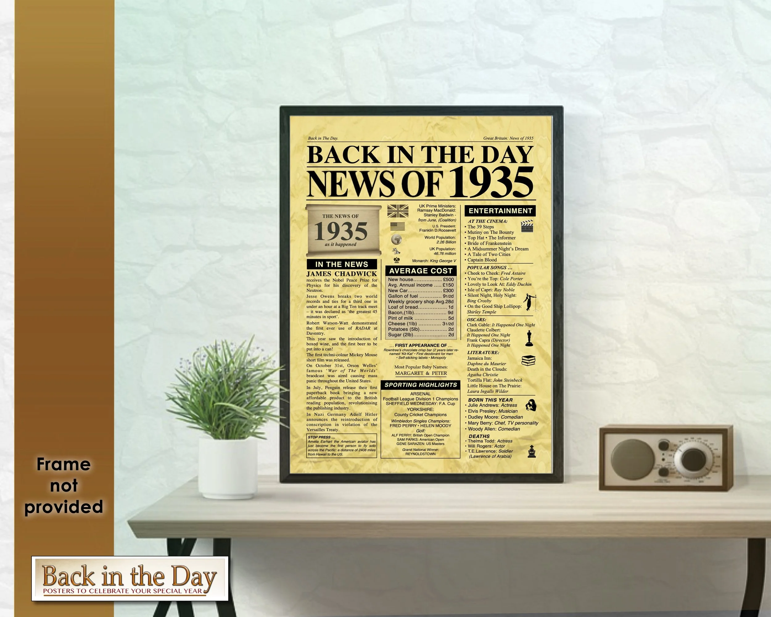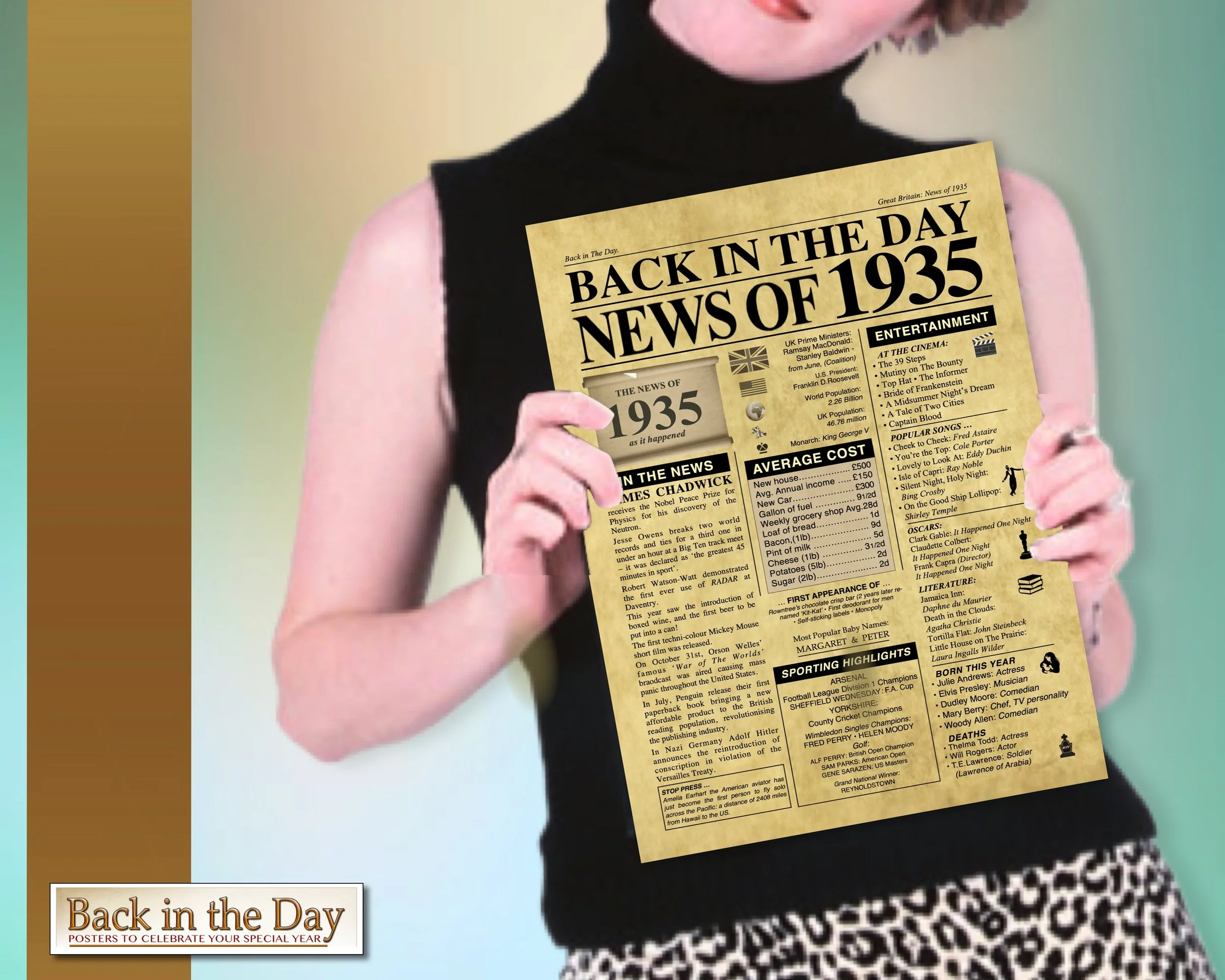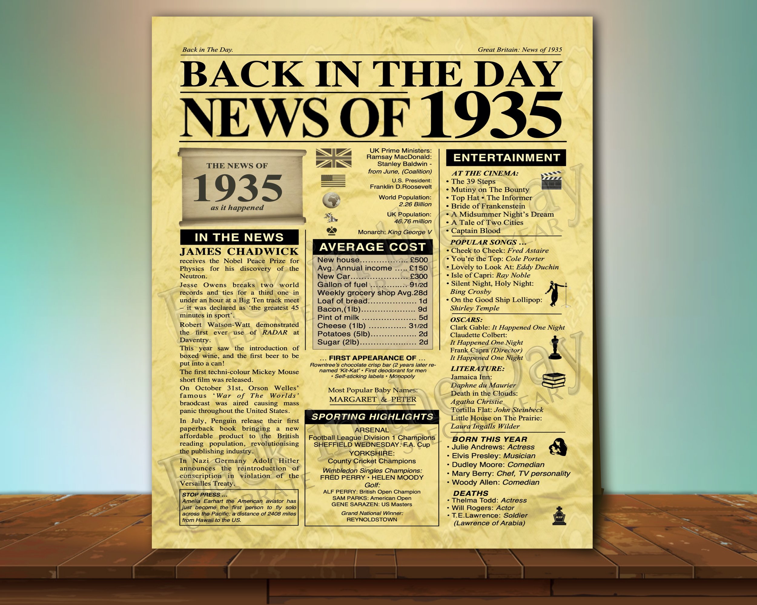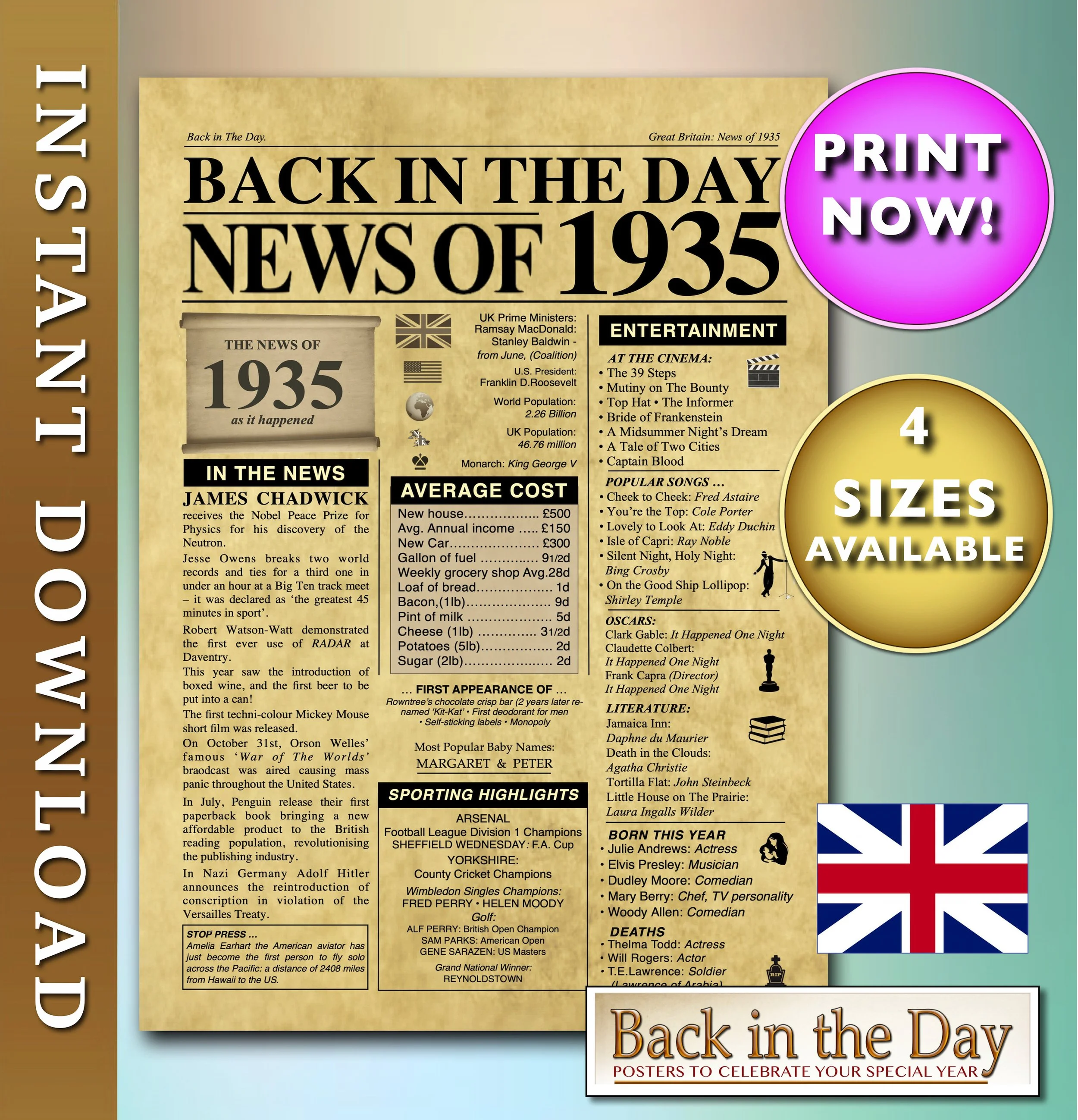 This 1935 artistically designed newspaper front page poster makes an excellent gift or centrepiece for any event or celebration where the year might be of interest. Available for immediate download in a range of size formats for you to print or get printed. It includesUK/world-based news and facts. It is NOT customisable, you are purchasing digital files for an instant DOWNLOAD. NO PHYSICAL PRINTED ITEM will be shipped to you.