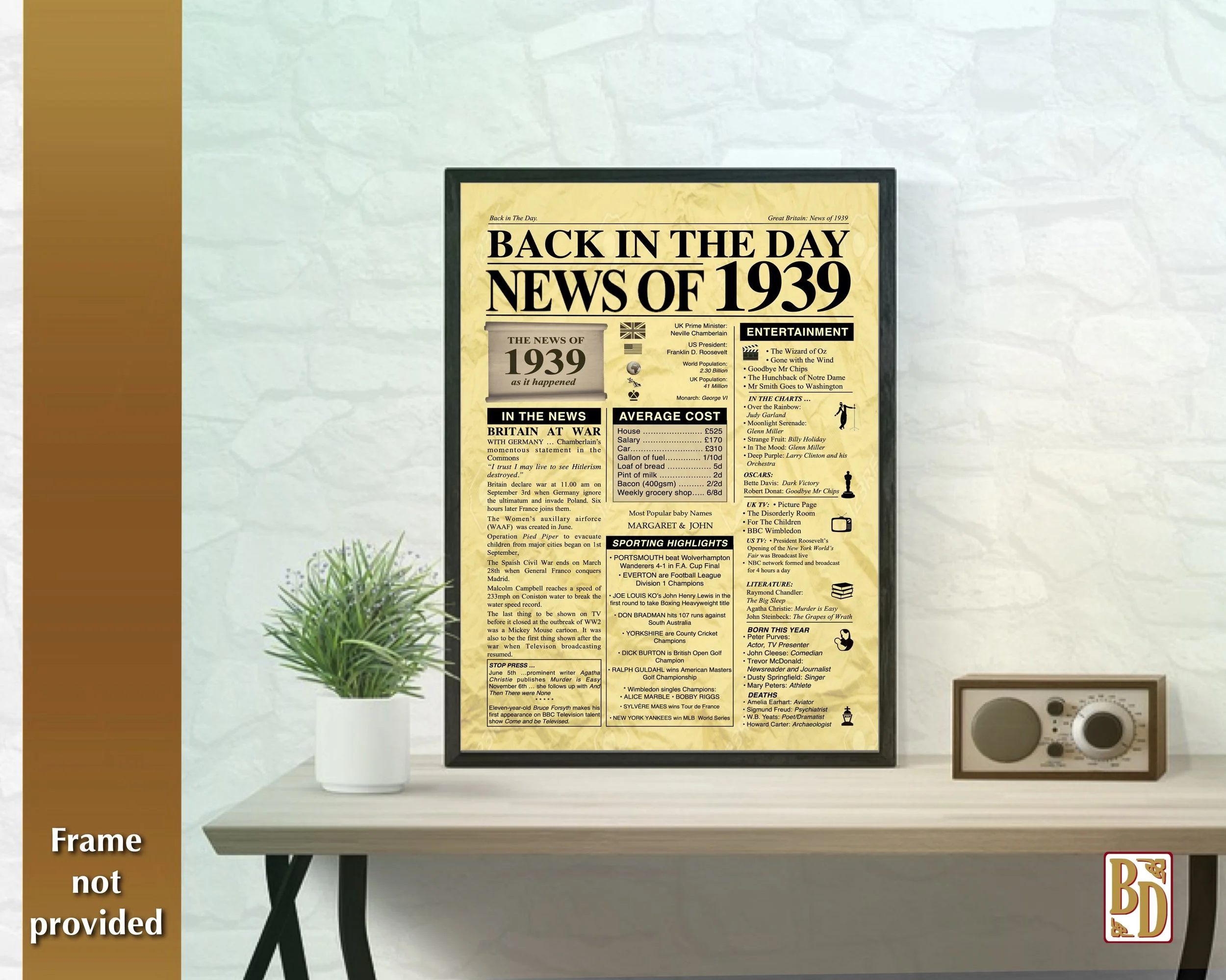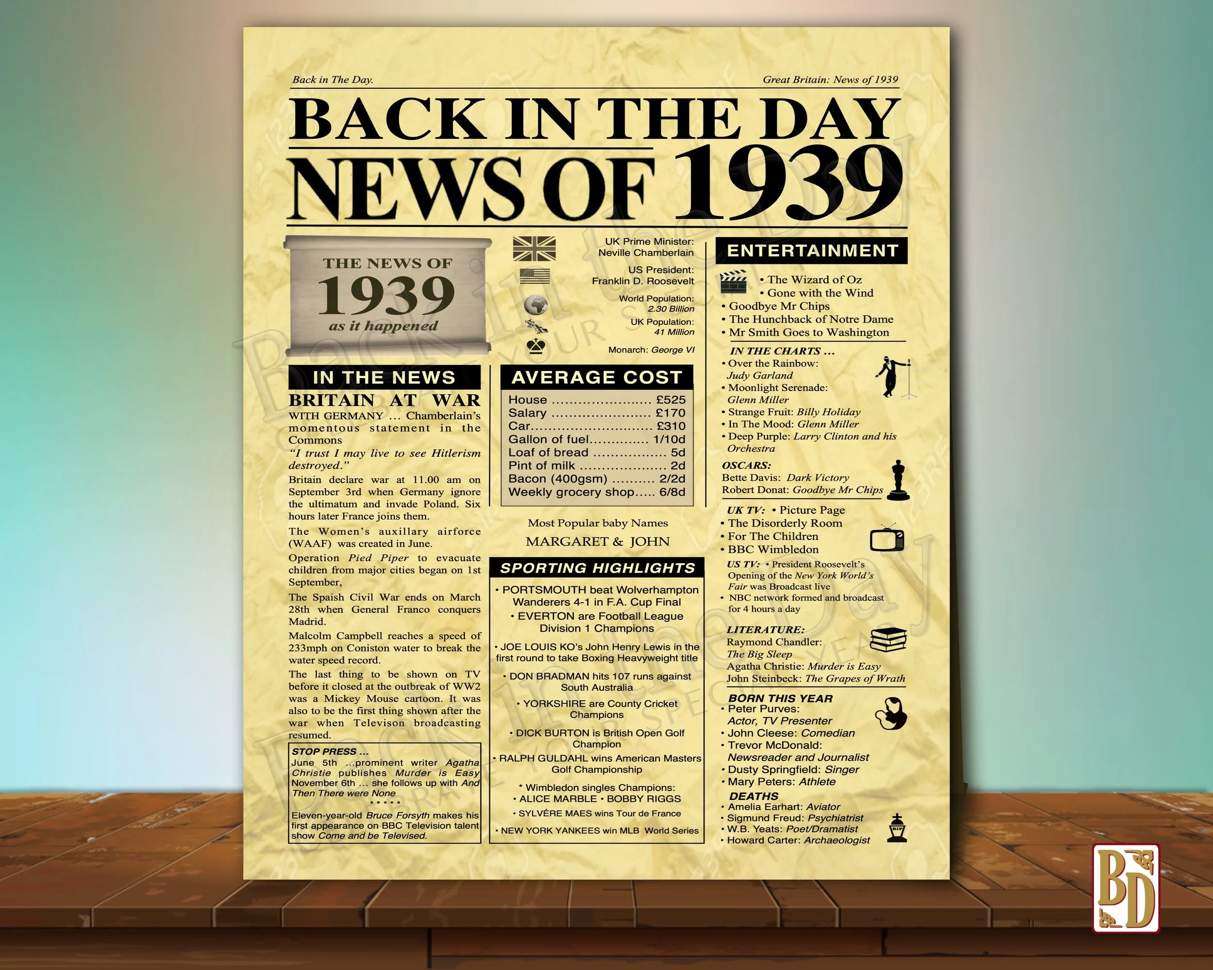 This 1939 artistically designed newspaper front page poster makes an excellent gift or centrepiece for any event or celebration where the year might be of interest. Available for immediate download in a range of size formats for you to print or get printed. It includesUK/world-based news and facts. It is NOT customisable, you are purchasing digital files for an instant DOWNLOAD. NO PHYSICAL PRINTED ITEM will be shipped to you.