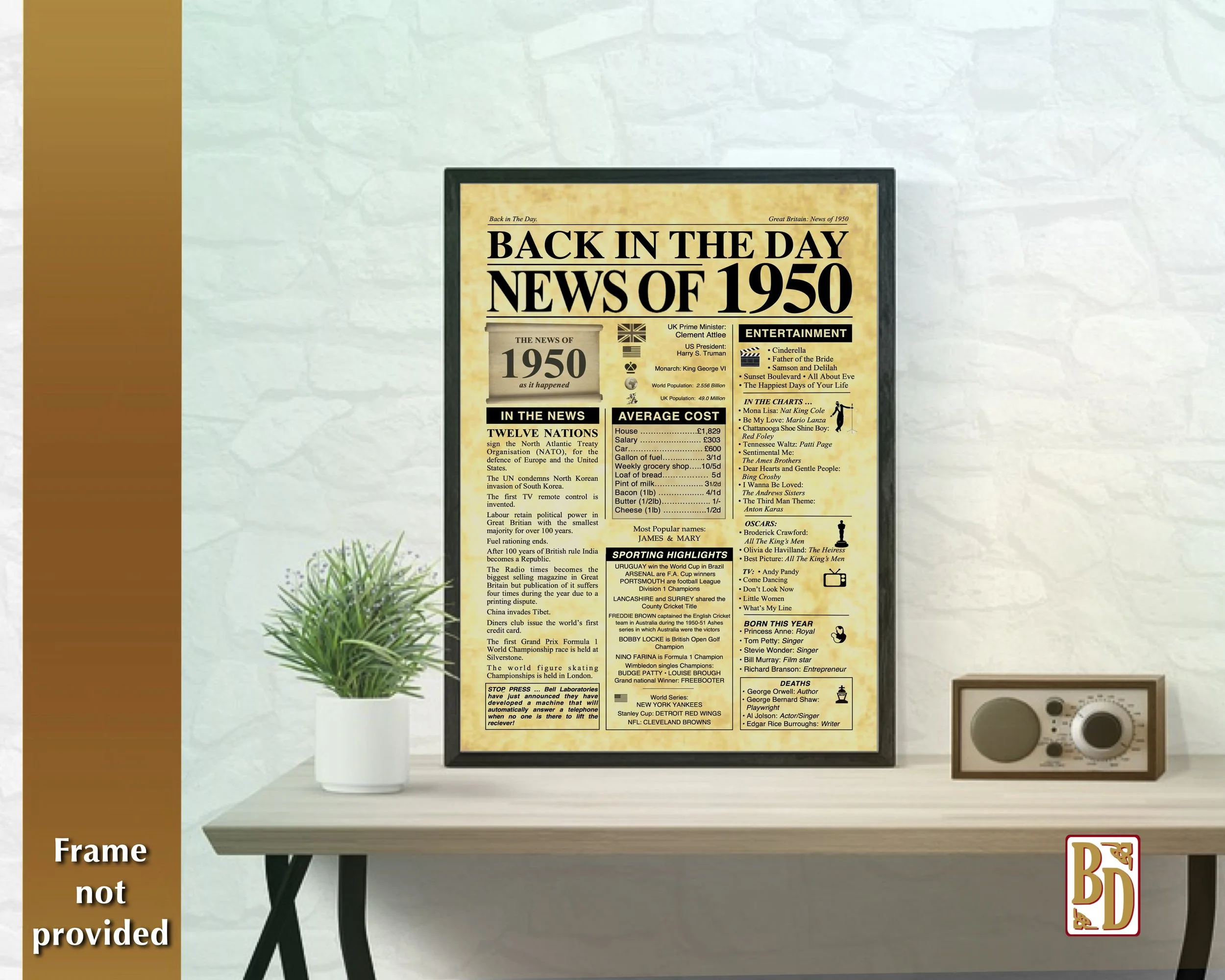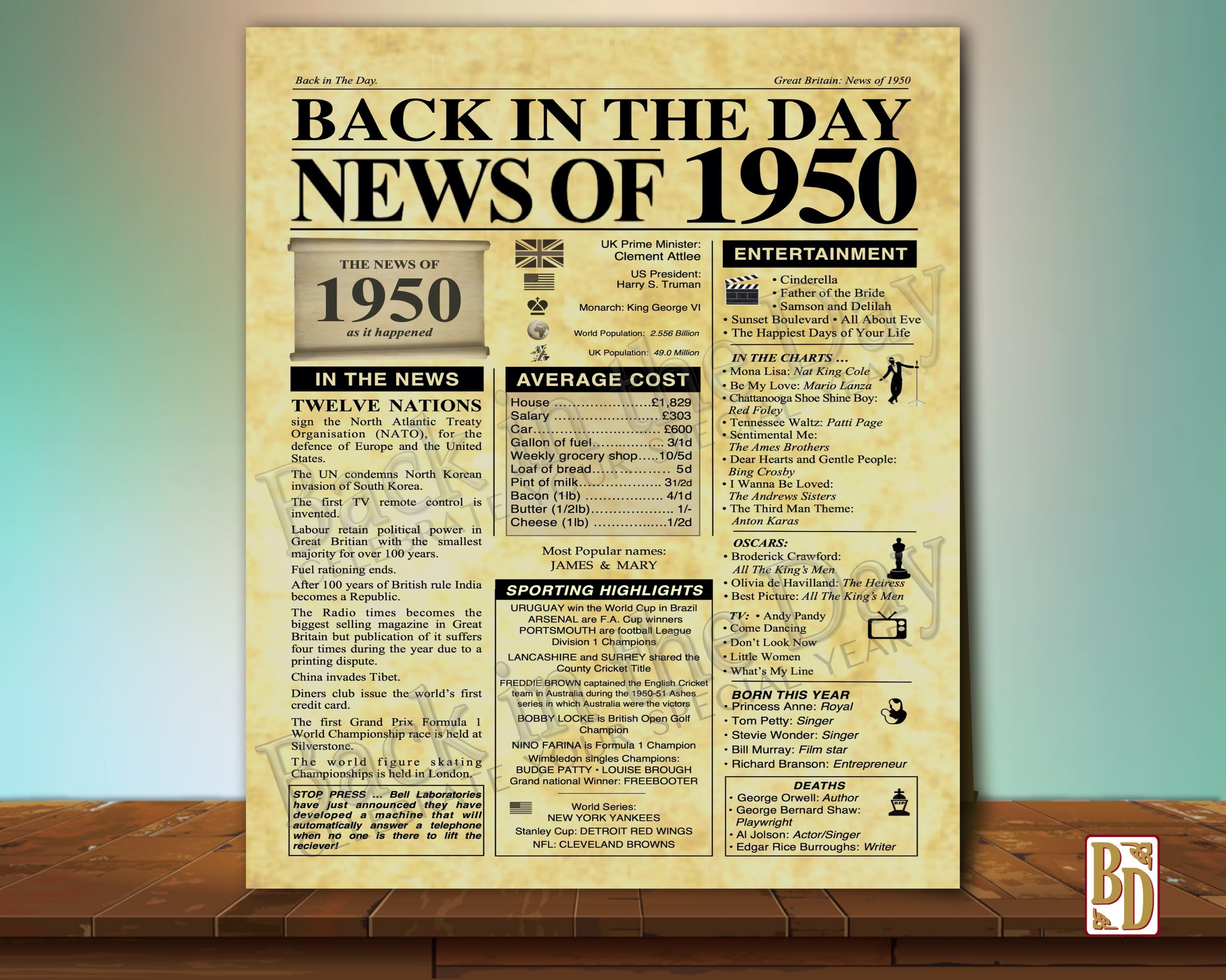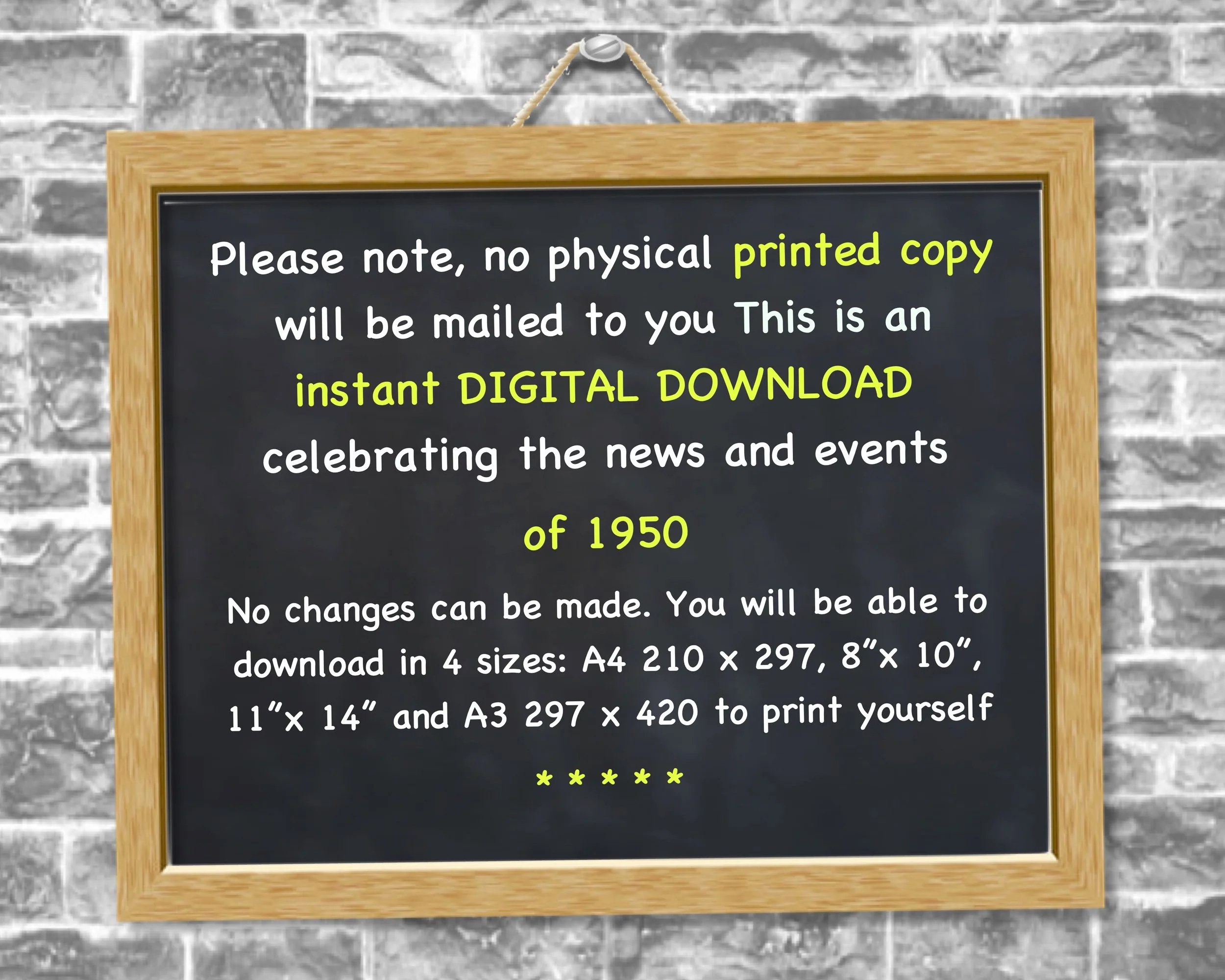 This 1950 artistically designed newspaper front page poster makes an excellent gift or centrepiece for any event or celebration where the year might be of interest. Available for immediate download in a range of size formats for you to print or get printed. It includesUK/world-based news and facts. It is NOT customisable, you are purchasing digital files for an instant DOWNLOAD. NO PHYSICAL PRINTED ITEM will be shipped to you.