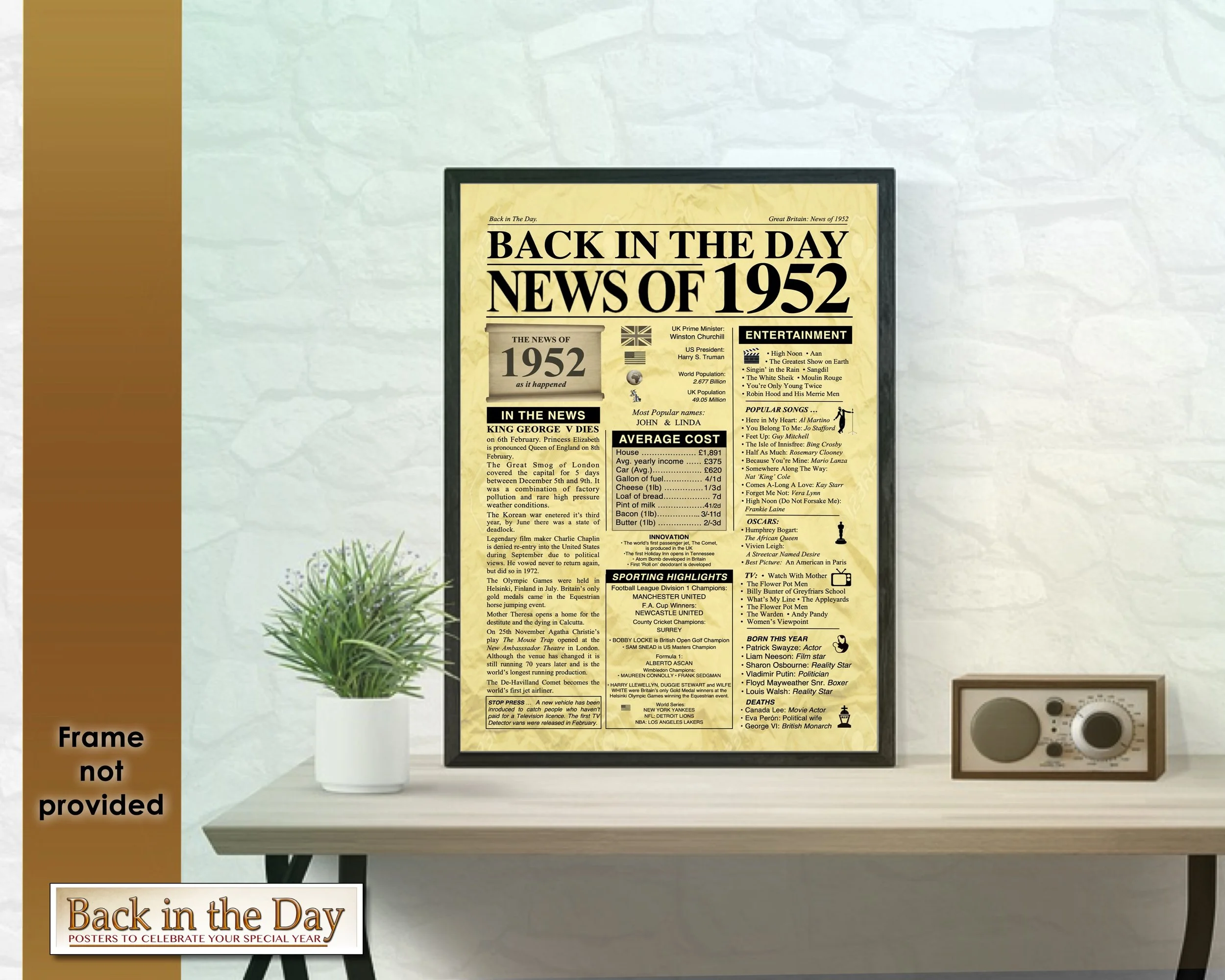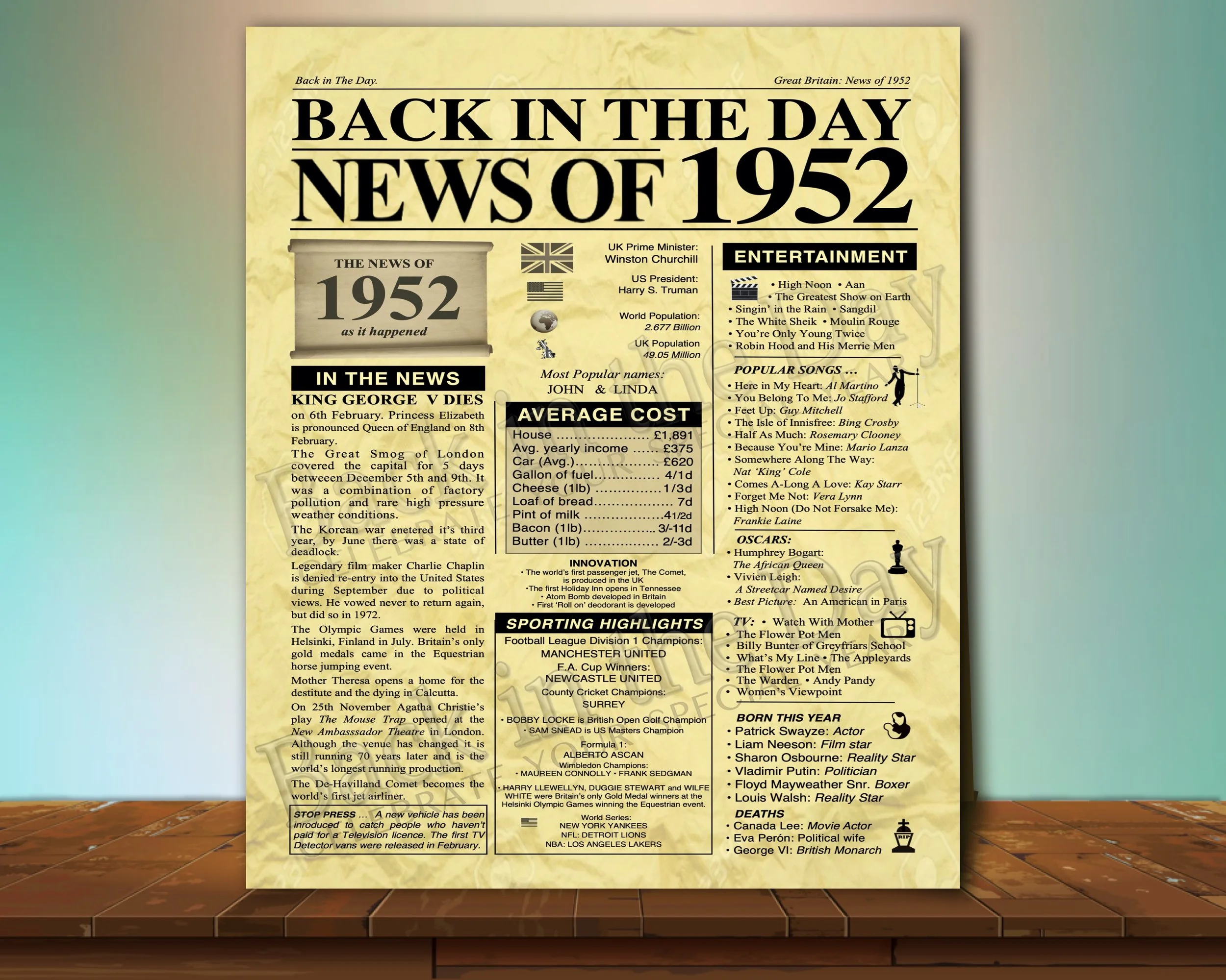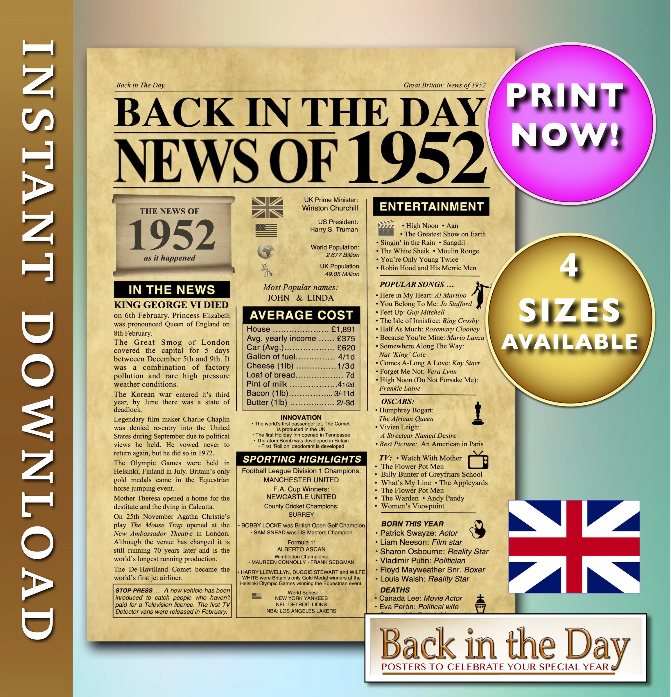 This 1952 artistically designed newspaper front page poster makes an excellent gift or centrepiece for any event or celebration where the year might be of interest. Available for immediate download in a range of size formats for you to print or get printed. It includesUK/world-based news and facts. It is NOT customisable, you are purchasing digital files for an instant DOWNLOAD. NO PHYSICAL PRINTED ITEM will be shipped to you.