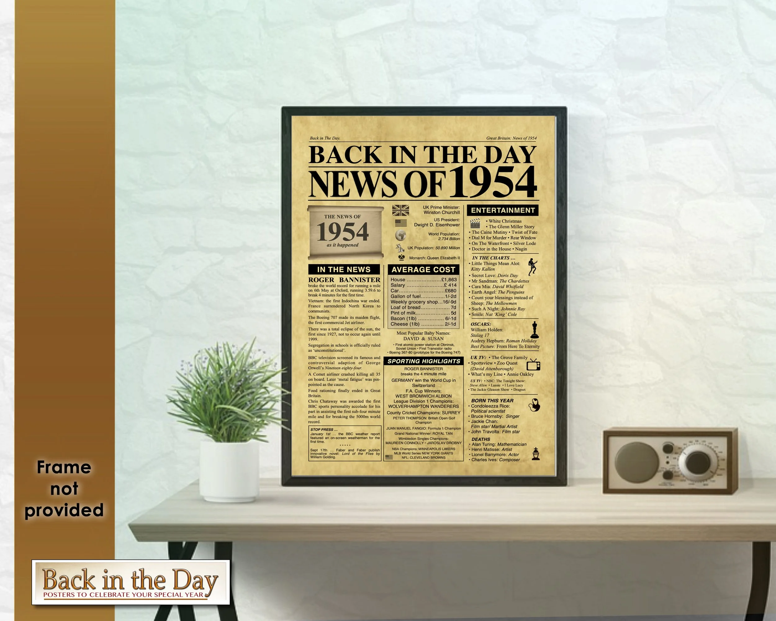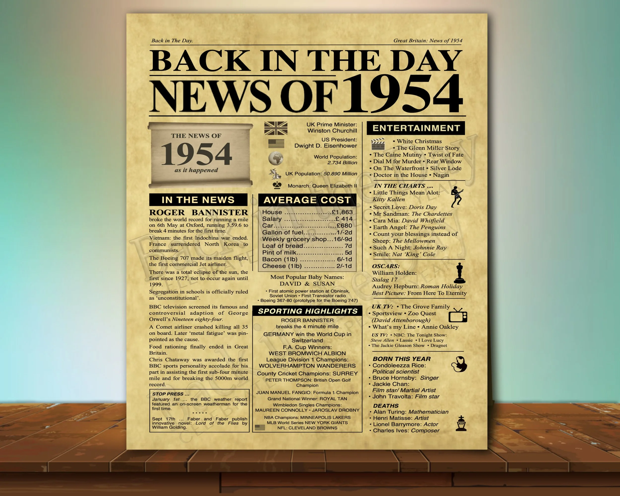 This 1954 artistically designed newspaper front page poster makes an excellent gift or centrepiece for any event or celebration where the year might be of interest. Available for immediate download in a range of size formats for you to print or get printed. It includesUK/world-based news and facts. It is NOT customisable, you are purchasing digital files for an instant DOWNLOAD. NO PHYSICAL PRINTED ITEM will be shipped to you.