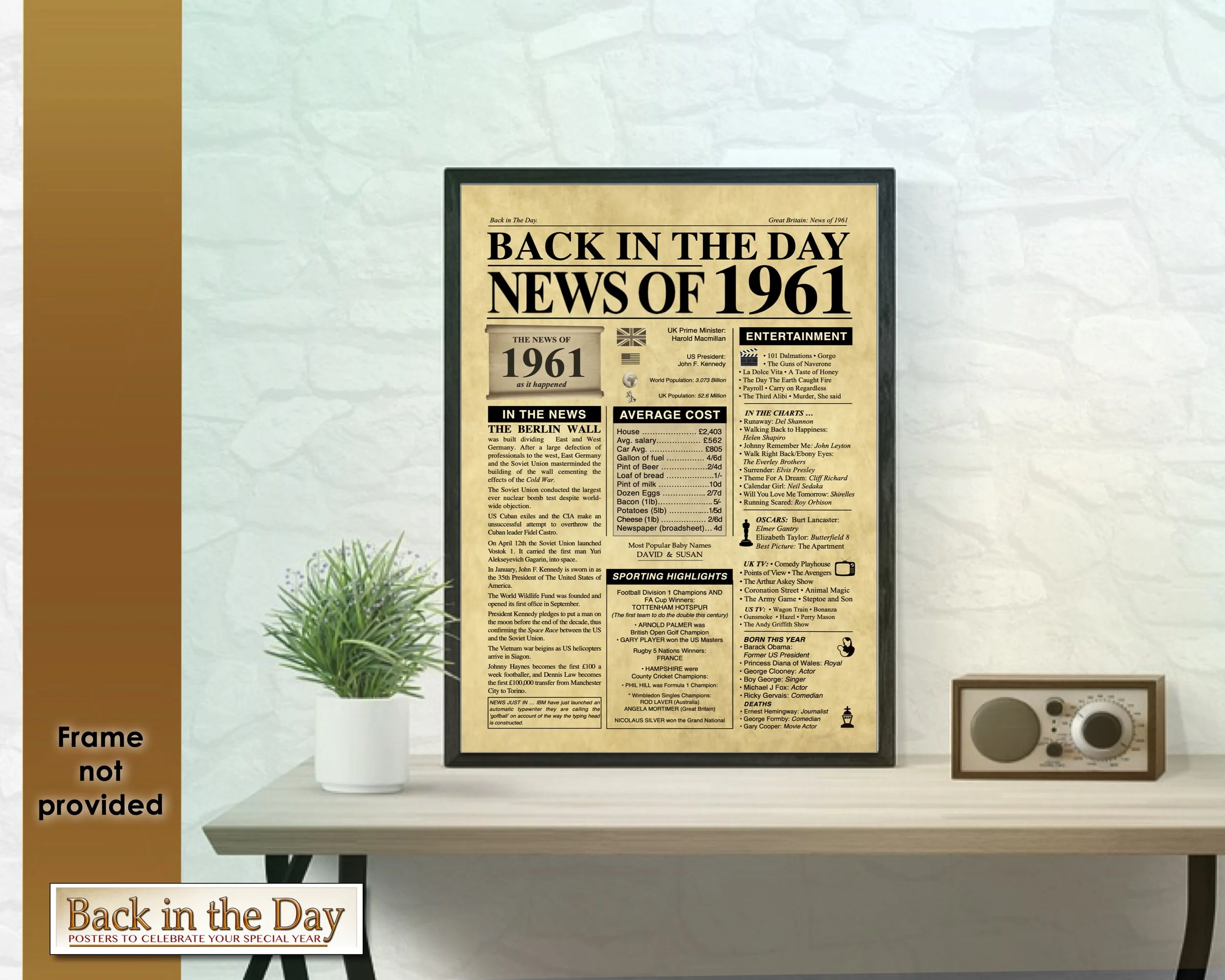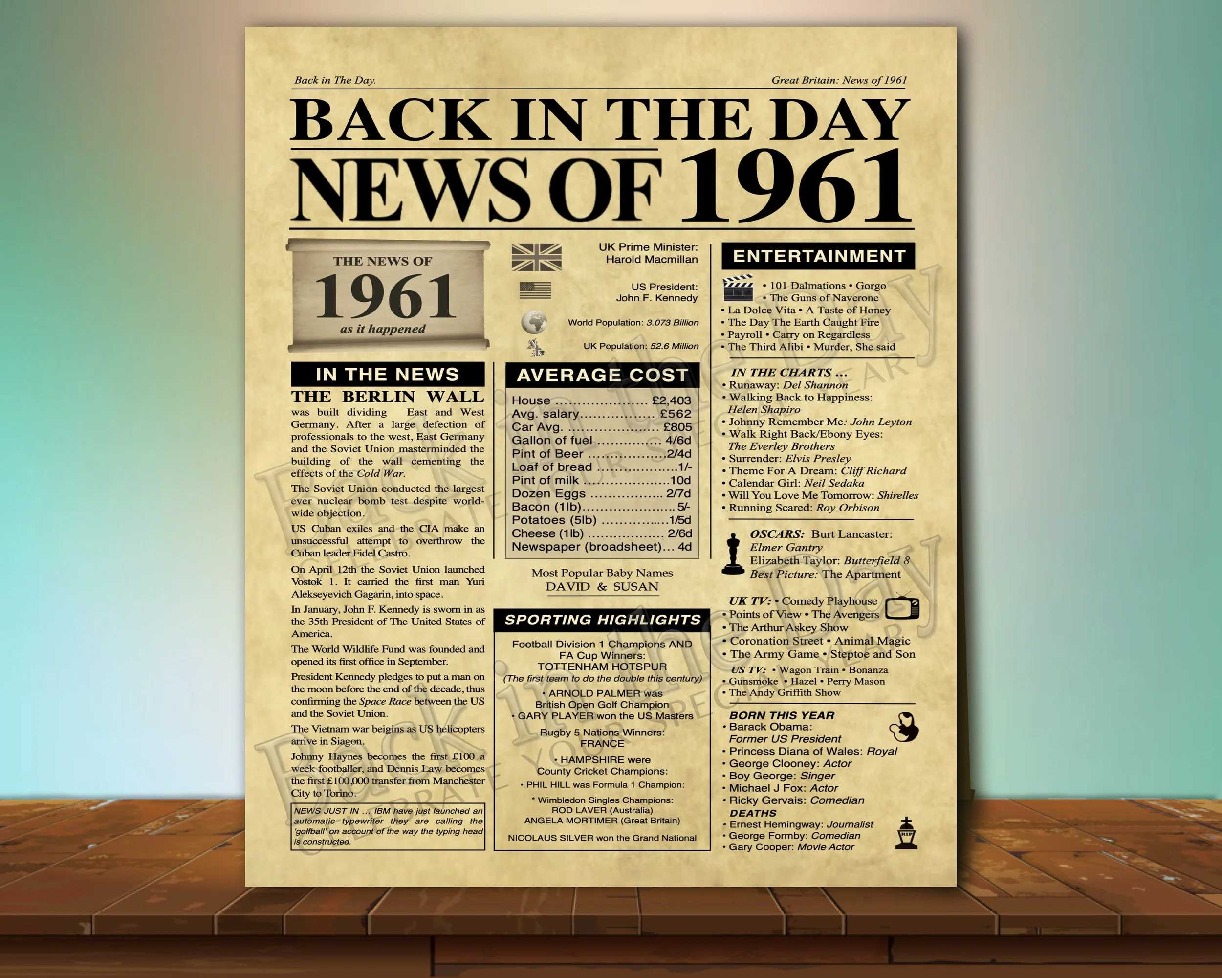 This 1961 artistically designed newspaper front page poster makes an excellent gift or centrepiece for any event or celebration where the year might be of interest. Available for immediate download in a range of size formats for you to print or get printed. It includesUK/world-based news and facts. It is NOT customisable, you are purchasing digital files for an instant DOWNLOAD. NO PHYSICAL PRINTED ITEM will be shipped to you.