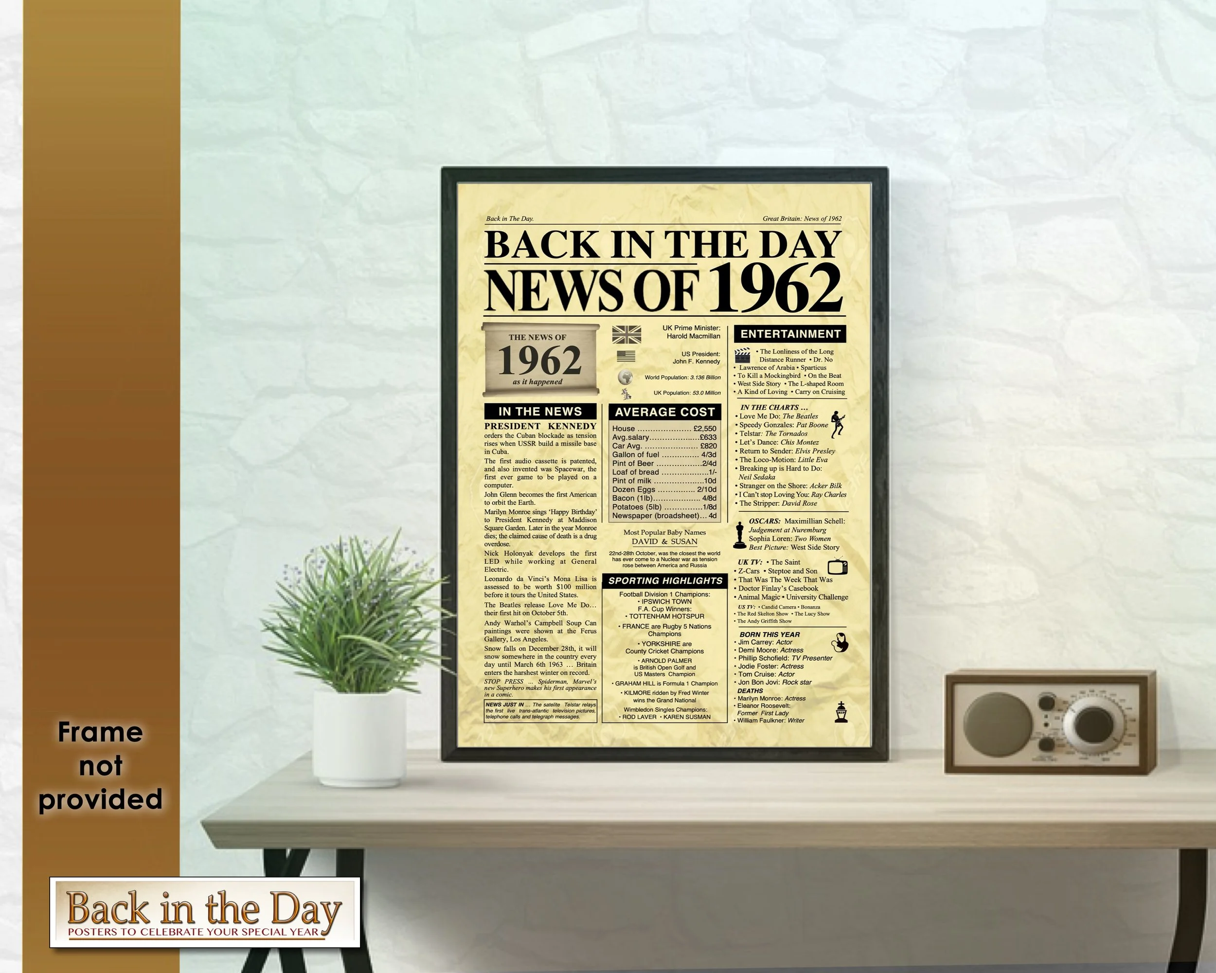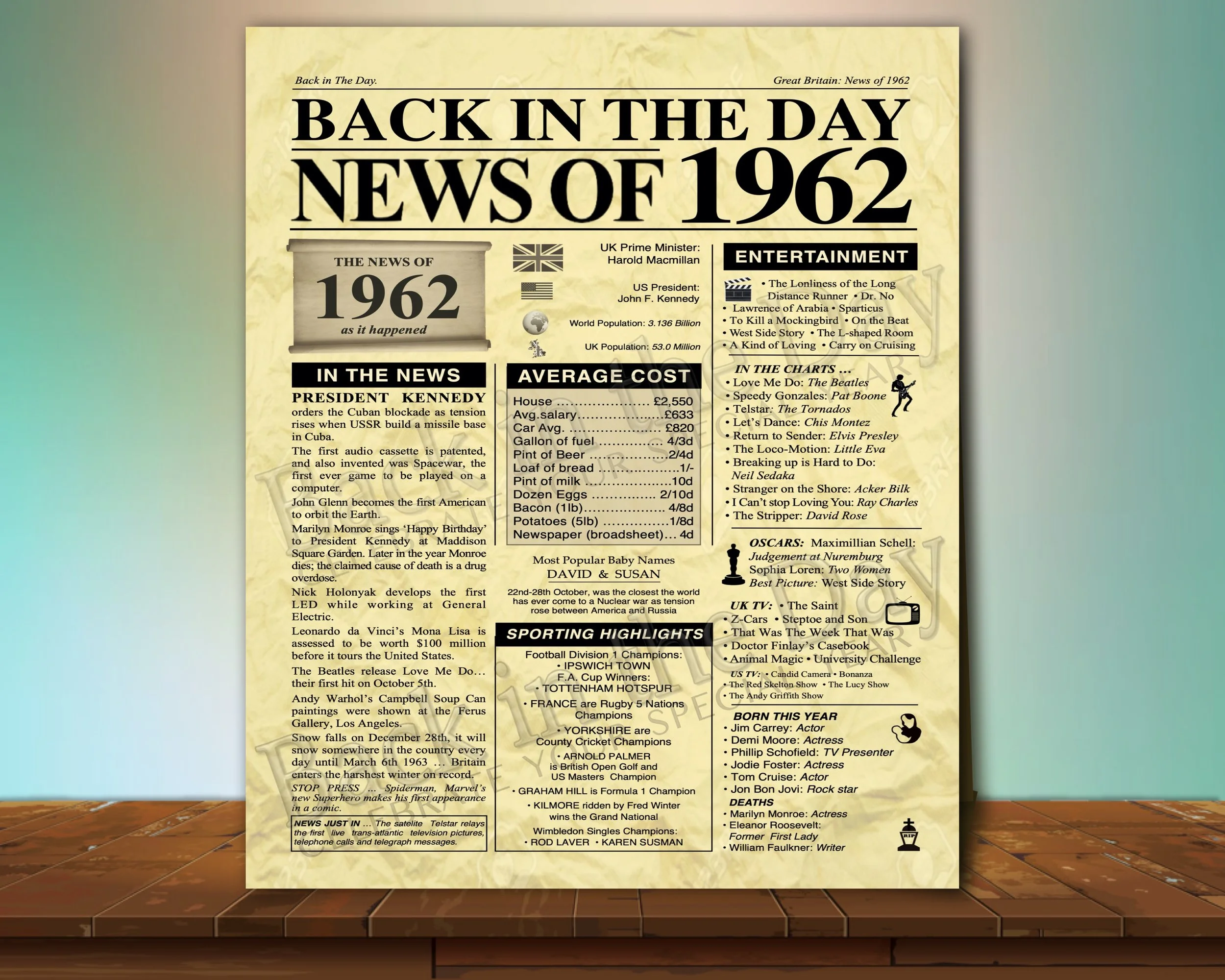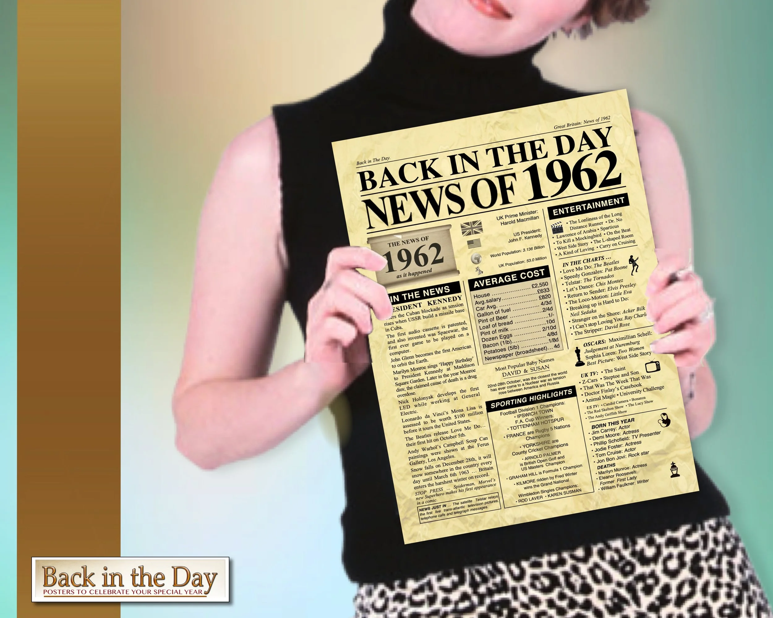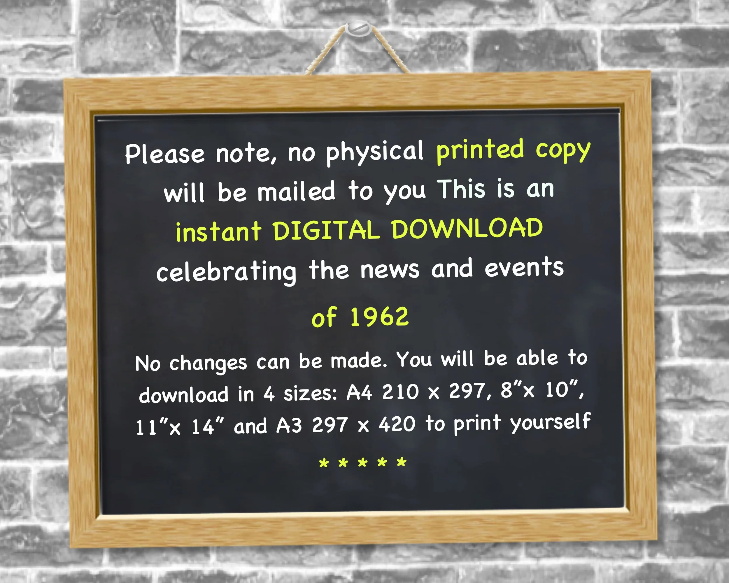 This 1962 artistically designed newspaper front page poster makes an excellent gift or centrepiece for any event or celebration where the year might be of interest. Available for immediate download in a range of size formats for you to print or get printed. It includesUK/world-based news and facts. It is NOT customisable, you are purchasing digital files for an instant DOWNLOAD. NO PHYSICAL PRINTED ITEM will be shipped to you.