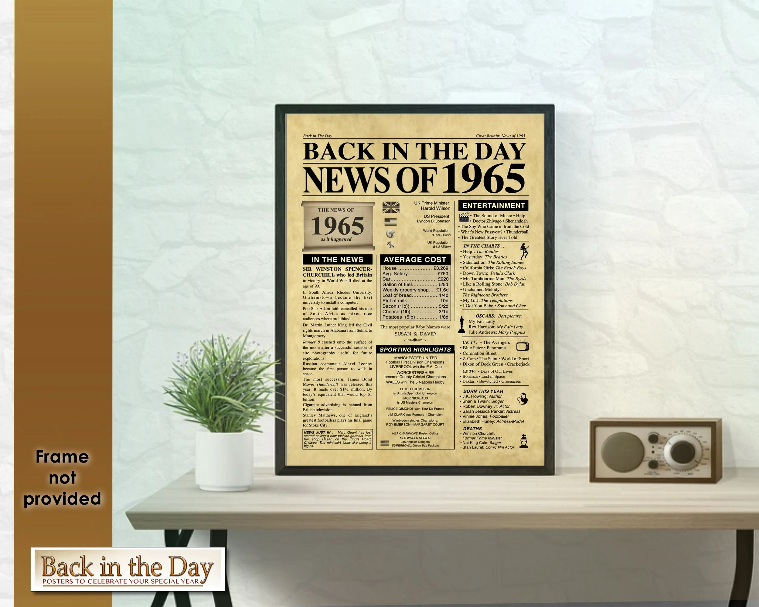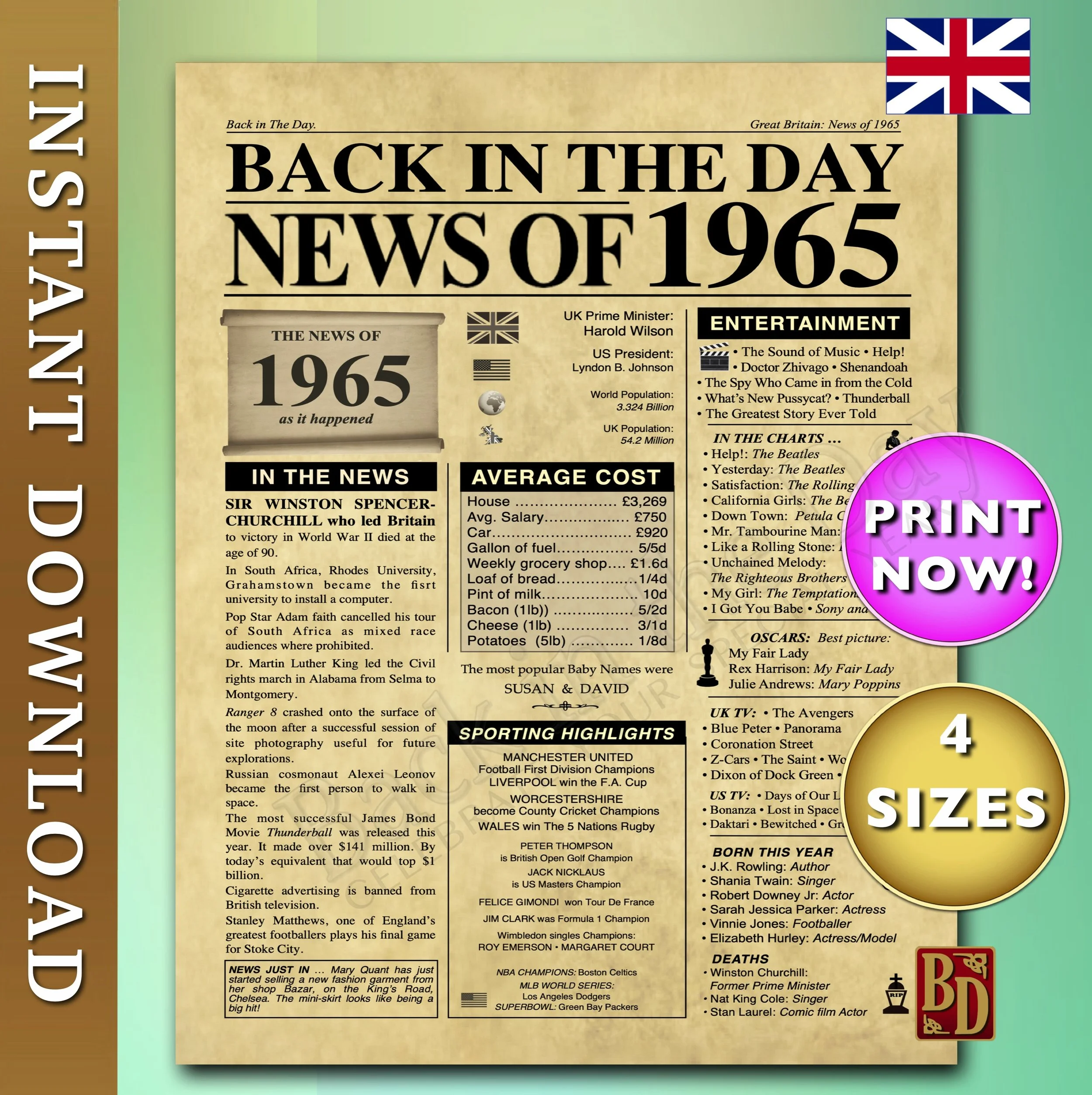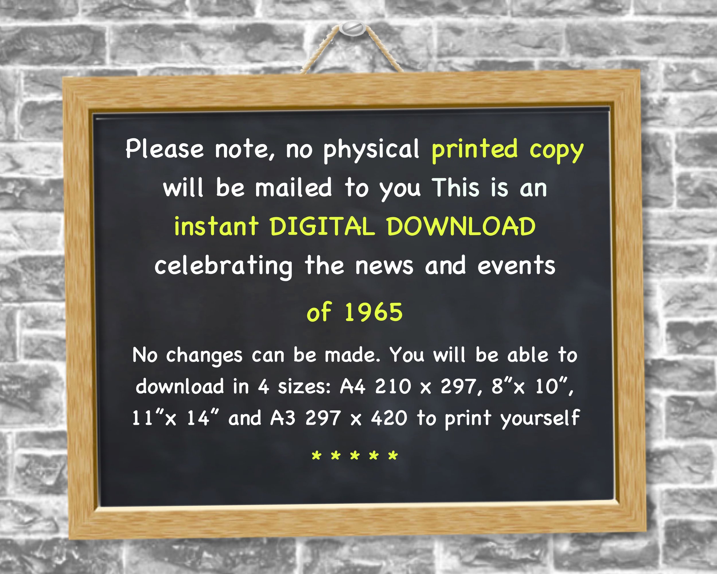 This 1965 artistically designed newspaper front page poster makes an excellent gift or centrepiece for any event or celebration where the year might be of interest. Available for immediate download in a range of size formats for you to print or get printed. It includesUK/world-based news and facts. It is NOT customisable, you are purchasing digital files for an instant DOWNLOAD. NO PHYSICAL PRINTED ITEM will be shipped to you.