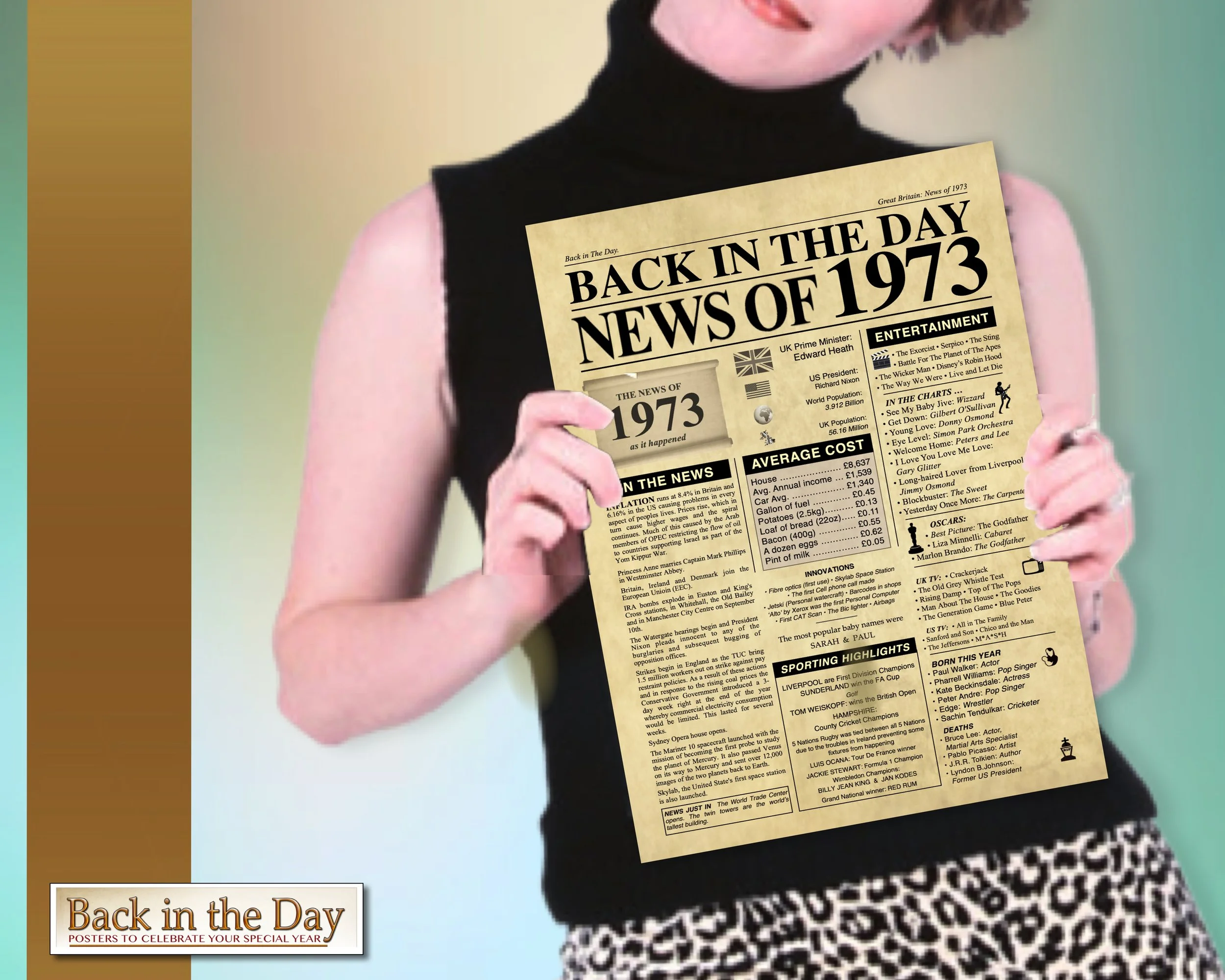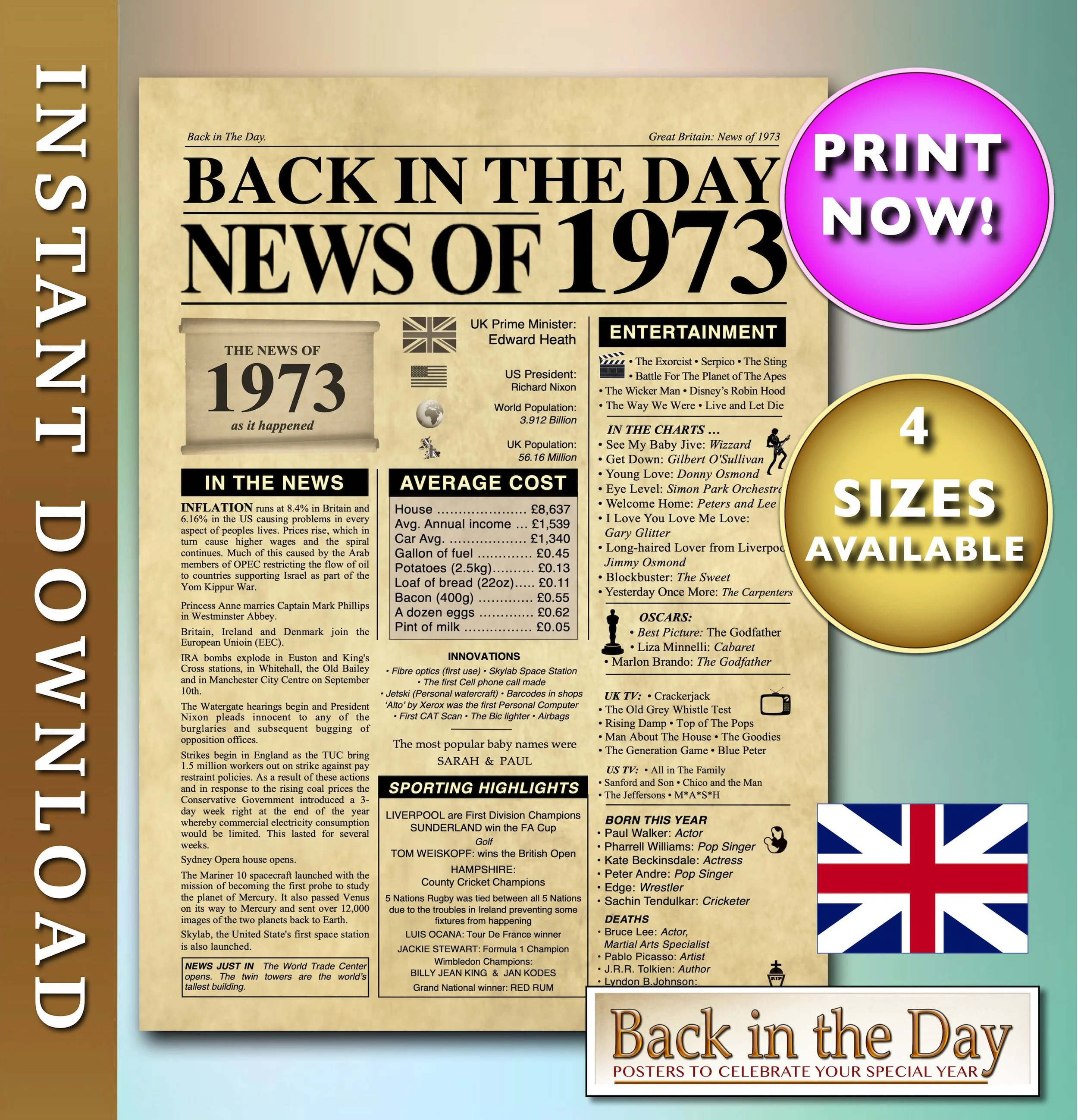 This 1973 artistically designed newspaper front page poster makes an excellent gift or centrepiece for any event or celebration where the year might be of interest. Available for immediate download in a range of size formats for you to print or get printed. It includesUK/world-based news and facts. It is NOT customisable, you are purchasing digital files for an instant DOWNLOAD. NO PHYSICAL PRINTED ITEM will be shipped to you.