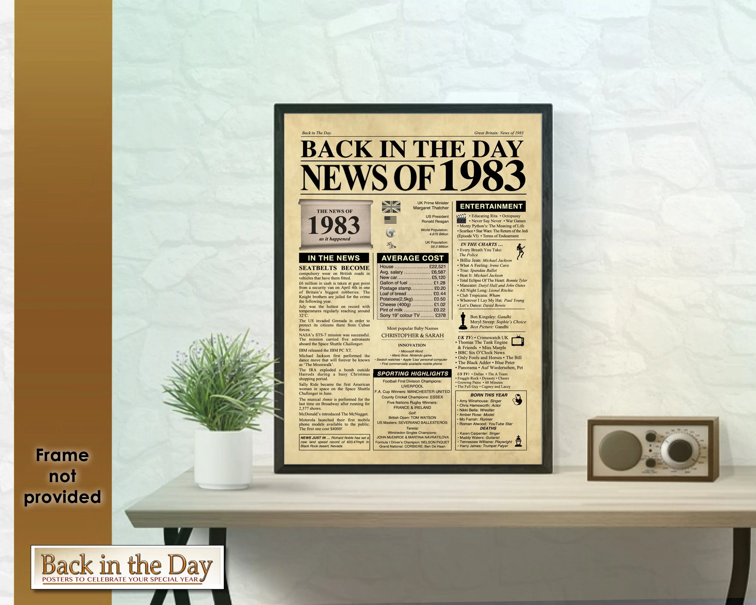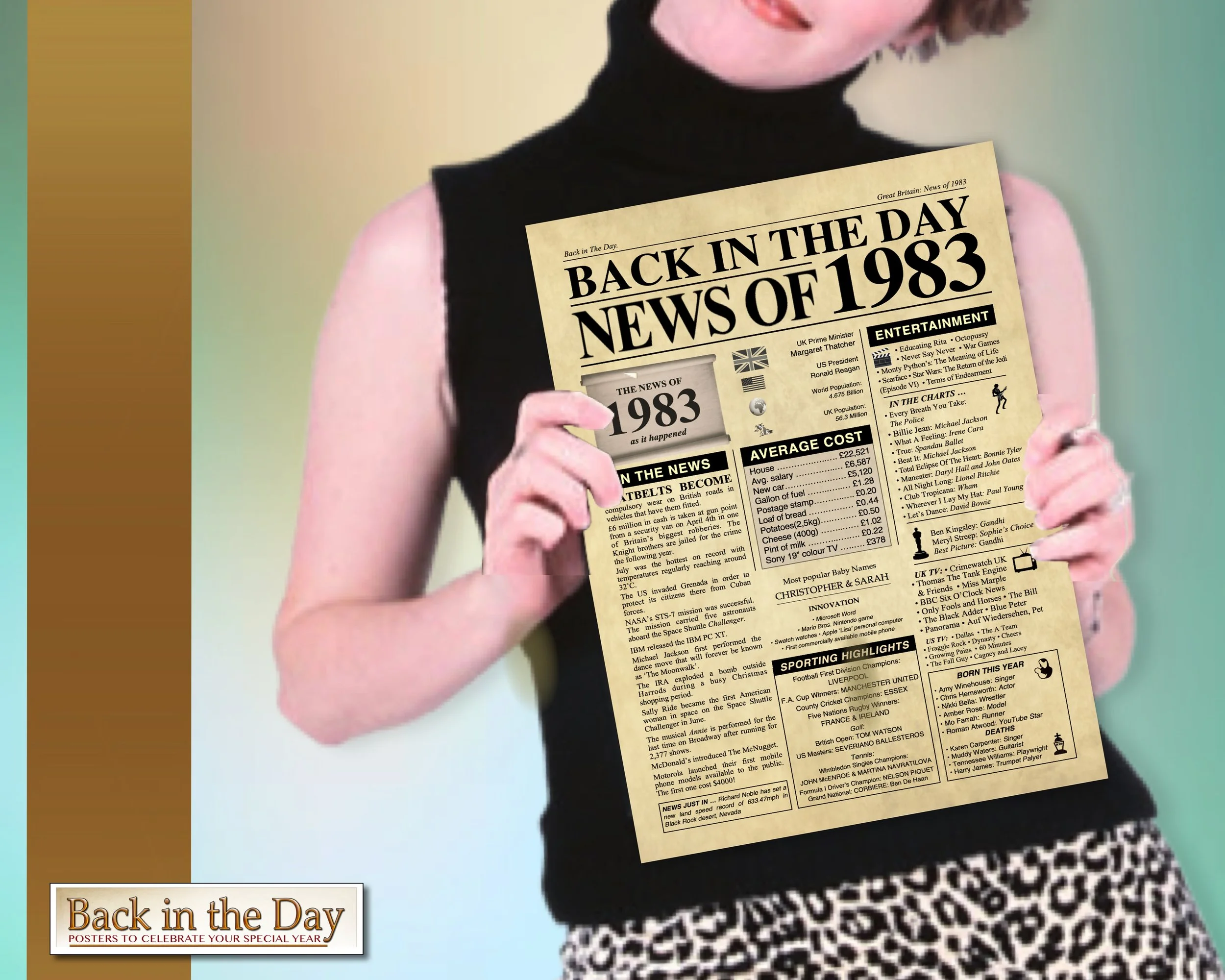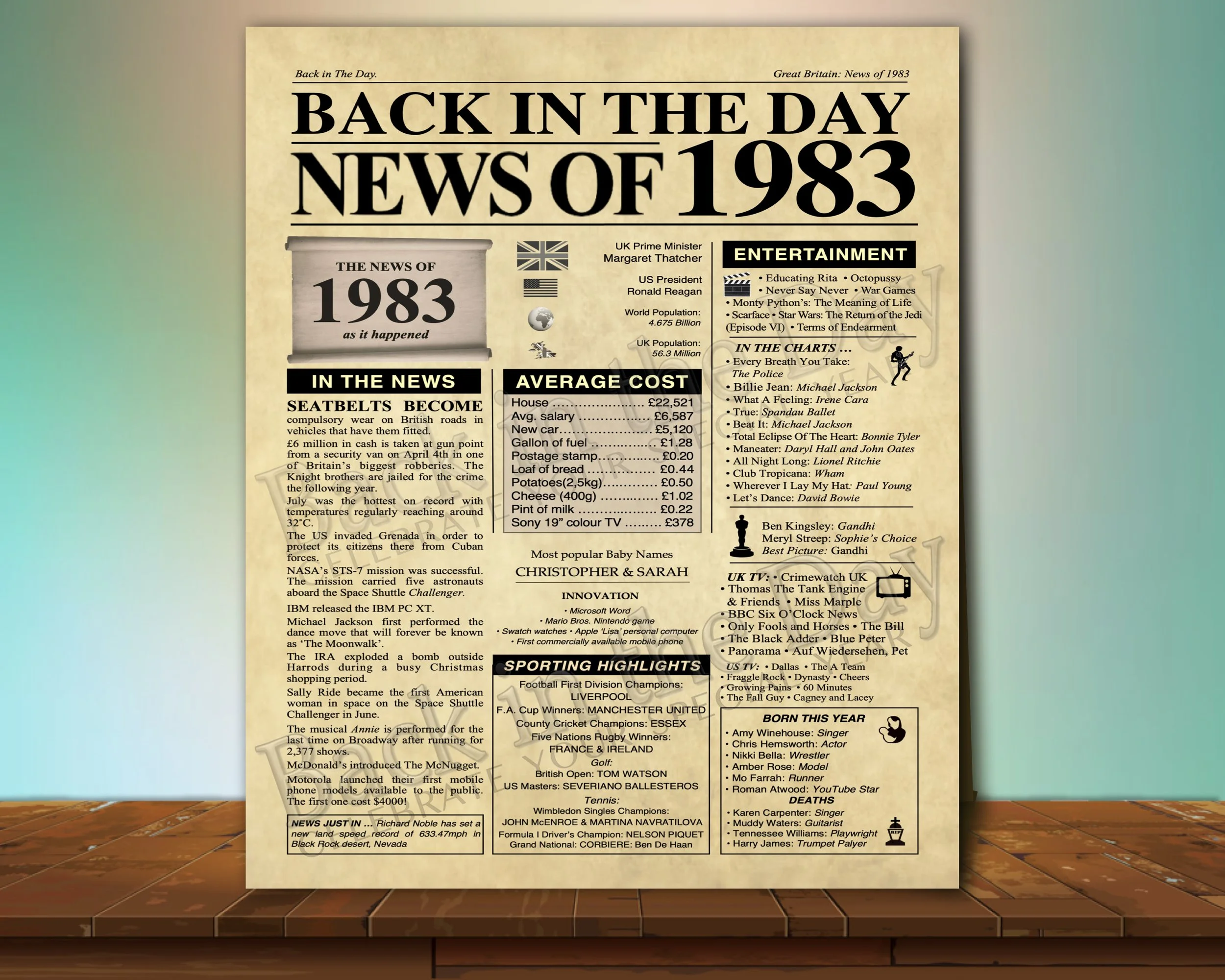 This 1983 artistically designed newspaper front page poster makes an excellent gift or centrepiece for any event or celebration where the year might be of interest. Available for immediate download in a range of size formats for you to print or get printed. It includesUK/world-based news and facts. It is NOT customisable, you are purchasing digital files for an instant DOWNLOAD. NO PHYSICAL PRINTED ITEM will be shipped to you.