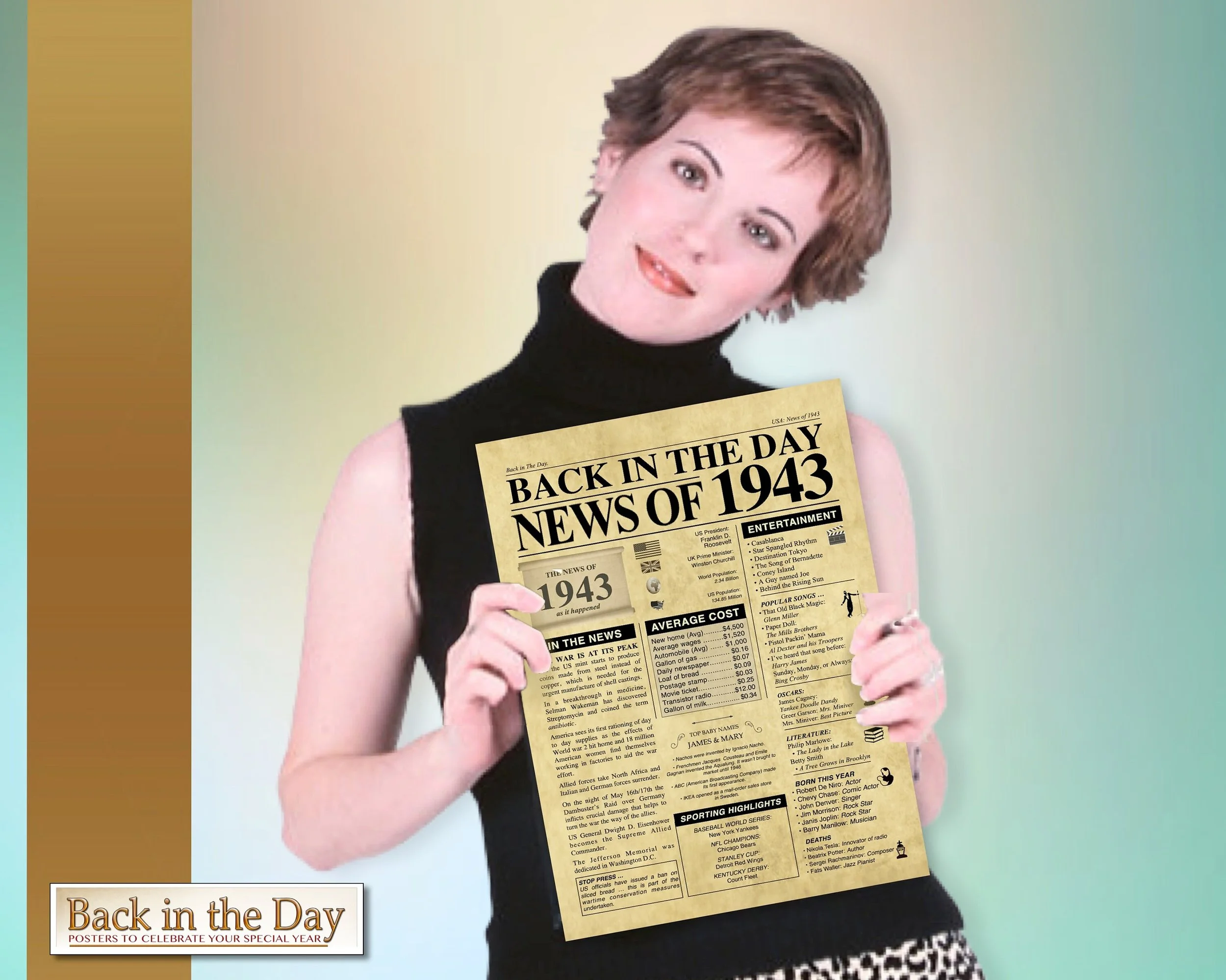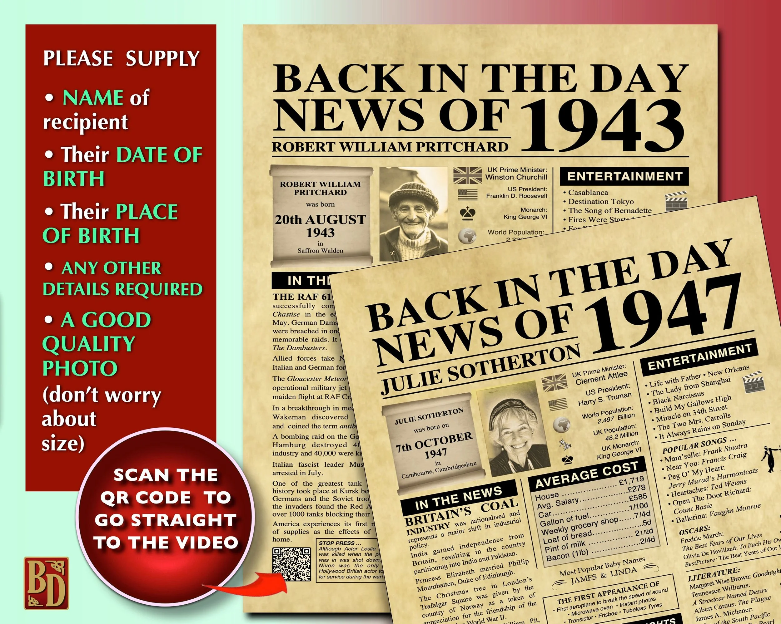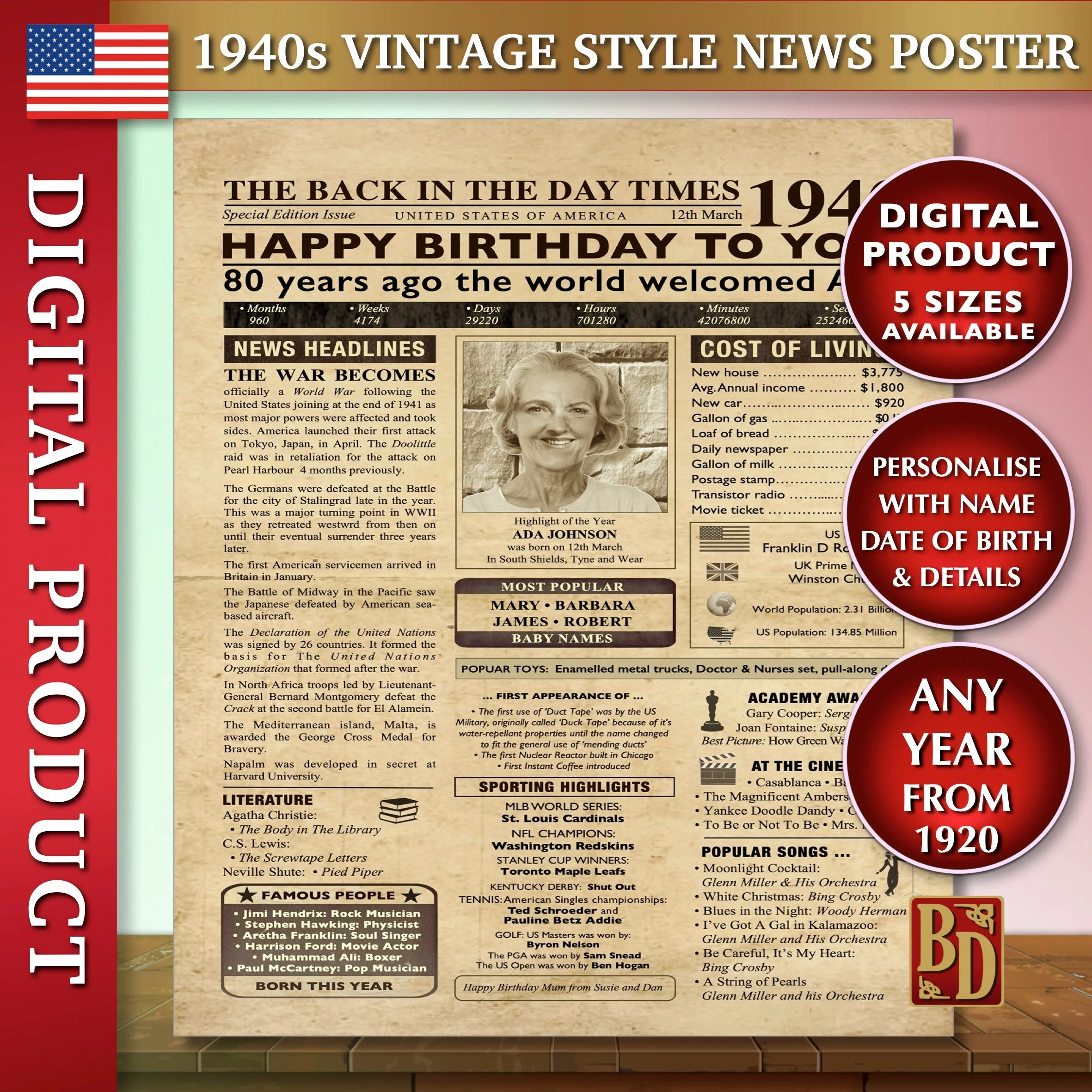 Back in 1940s POSTERS Categories: All Back in Any Year POSTERS News / Video BESTSELLERS News Direct DOWNLOADS Direct DOWNLOADS Colour 1920s -1930s POSTERS Back in 1940s POSTERS Back in 1950s POSTERS Back in 1960s POSTERS Back in 1970s POSTERS Back in 1980s POSTERS Back in 1990s POSTERS Back in 2000s POSTERS Back in 2010-20 POSTERS Historical POSTERS Anniversary POSTERS Special Occasion POSTERS Personalised CARDS QUIZZES & Trivia PRINTED items Great Moments in SPORT Back in 1940s POSTERS Personalised 1940s Newspaper Poster AND VIDEO UK Version for any year back in the 1940s Birthday Sign from £23.00 Select Video images - 60 Characters limit each Standard - no extras 1 extra slide image 2 extra slide images 3 extra slide images 4 extra slide images Purchase Added! Personalised Framed 1940s Newspaper Printed Poster AND VIDEO, UK Version for any year back in the 1940s Birthday Sign from £33.00 View Options 80th birthday gift for him or her, 1940s vintage birthday newspaper poster sign £10.00 Purchase Added! Birthday news personalised newspaper print poster, Birthday poster milestone, Back in 1944, Birthday news printable £9.75 Purchase Added! Birthday news personalised newspaper front X 8. 1944-2024 £32.50 Purchase Added! Back in 1940s Poster, Vintage Birthday Personalised Newspaper £10.00 Purchase Added! The year you were born 1943, Celebration News Poster, back in the day 1943. UK version £4.49 Purchase Added! 1943, Celebration News Poster, back in the day 1943. US version £4.49 Purchase Added!