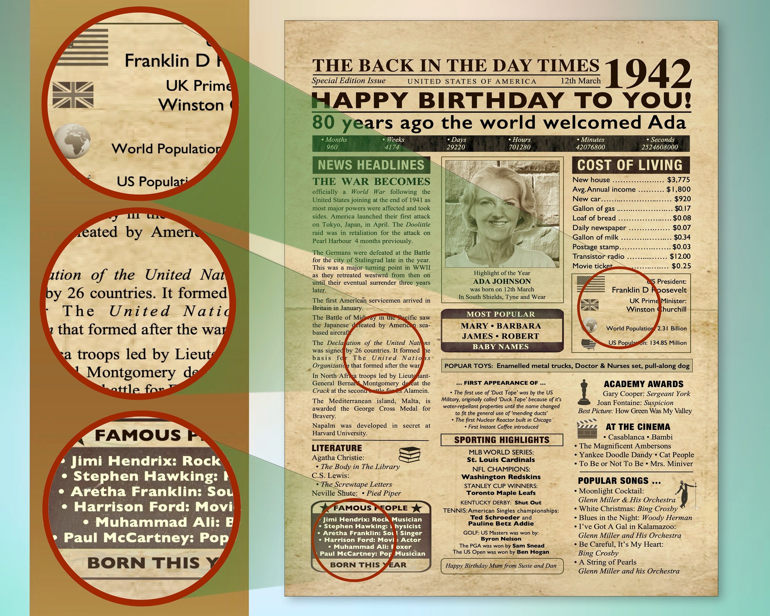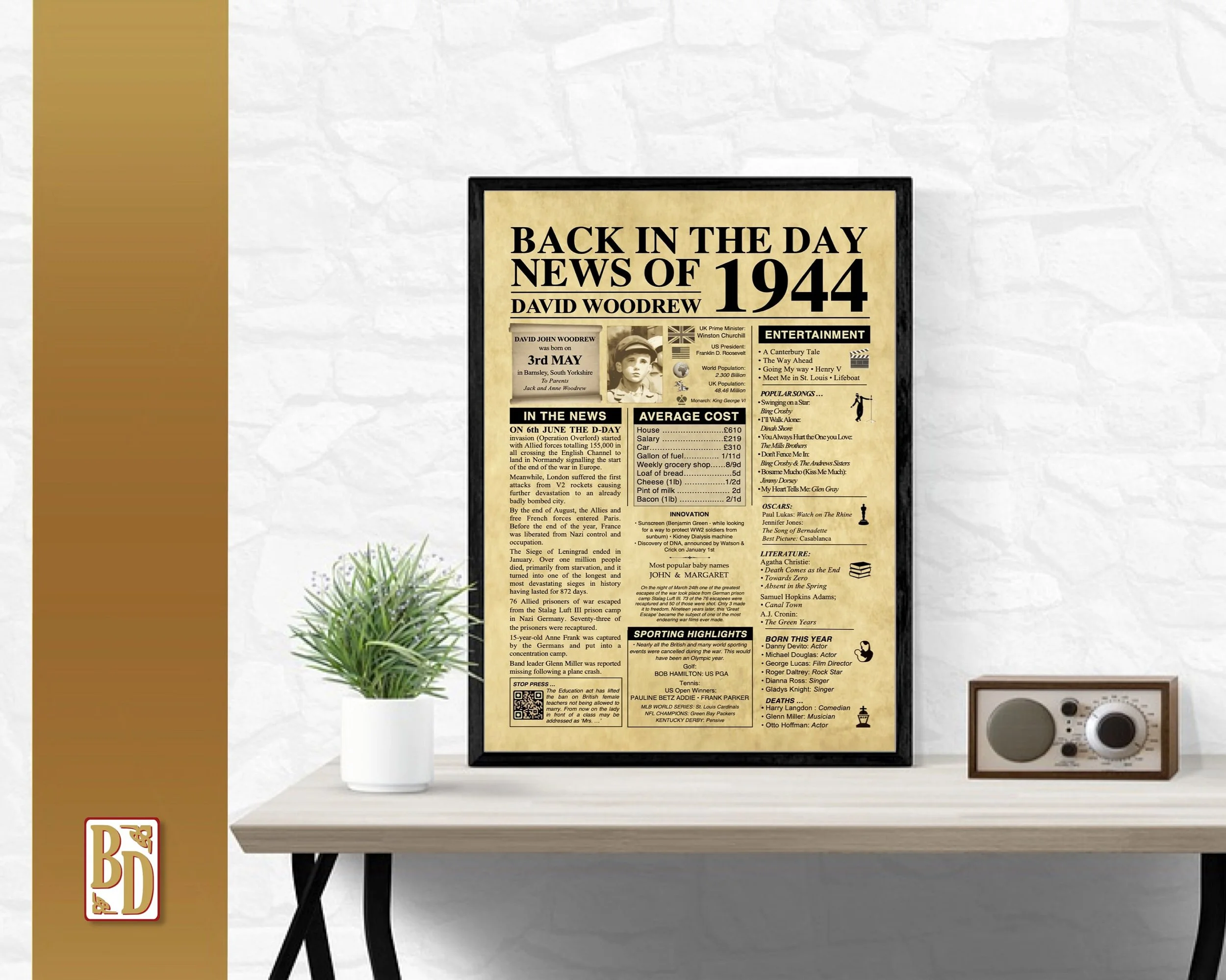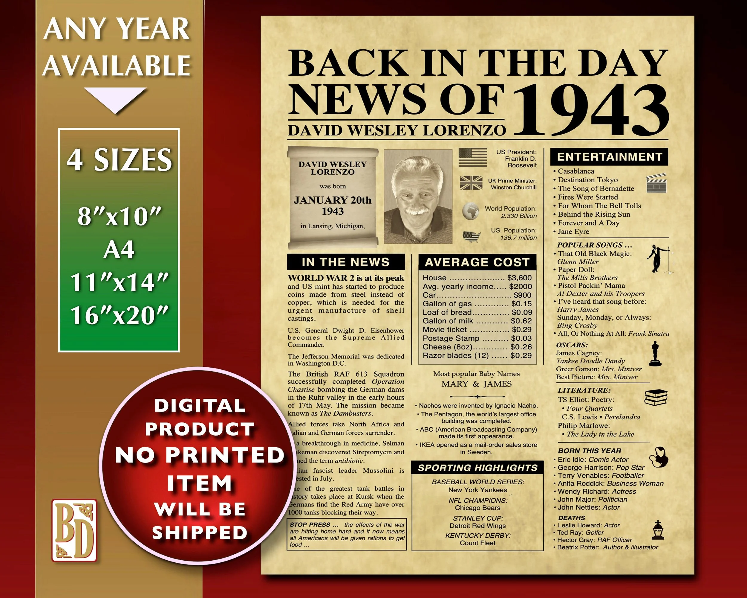 Back in 1940s POSTERS Categories: All Back in Any Year POSTERS News / Video BESTSELLERS News Direct DOWNLOADS Direct DOWNLOADS Colour 1920s -1930s POSTERS Back in 1940s POSTERS Back in 1950s POSTERS Back in 1960s POSTERS Back in 1970s POSTERS Back in 1980s POSTERS Back in 1990s POSTERS Back in 2000s POSTERS Back in 2010-20 POSTERS Historical POSTERS Anniversary POSTERS Special Occasion POSTERS Personalised CARDS QUIZZES & Trivia PRINTED items Great Moments in SPORT Back in 1940s POSTERS Personalised 1940s Newspaper Poster AND VIDEO UK Version for any year back in the 1940s Birthday Sign from £23.00 Select Video images - 60 Characters limit each Standard - no extras 1 extra slide image 2 extra slide images 3 extra slide images 4 extra slide images Purchase Added! Personalised Framed 1940s Newspaper Printed Poster AND VIDEO, UK Version for any year back in the 1940s Birthday Sign from £33.00 View Options 80th birthday gift for him or her, 1940s vintage birthday newspaper poster sign £10.00 Purchase Added! Birthday news personalised newspaper print poster, Birthday poster milestone, Back in 1944, Birthday news printable £9.75 Purchase Added! Birthday news personalised newspaper front X 8. 1944-2024 £32.50 Purchase Added! Back in 1940s Poster, Vintage Birthday Personalised Newspaper £10.00 Purchase Added! The year you were born 1943, Celebration News Poster, back in the day 1943. UK version £4.49 Purchase Added! 1943, Celebration News Poster, back in the day 1943. US version £4.49 Purchase Added!