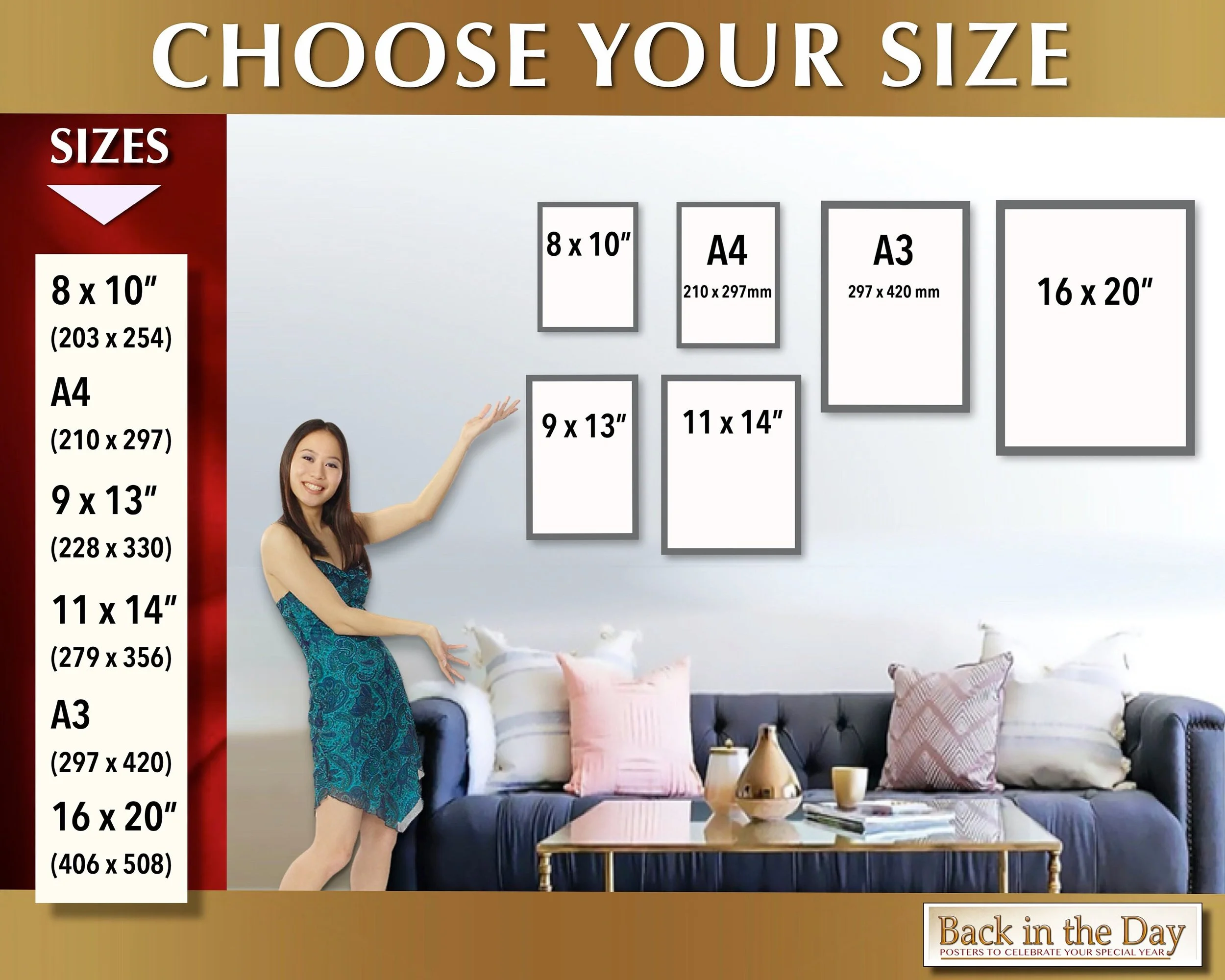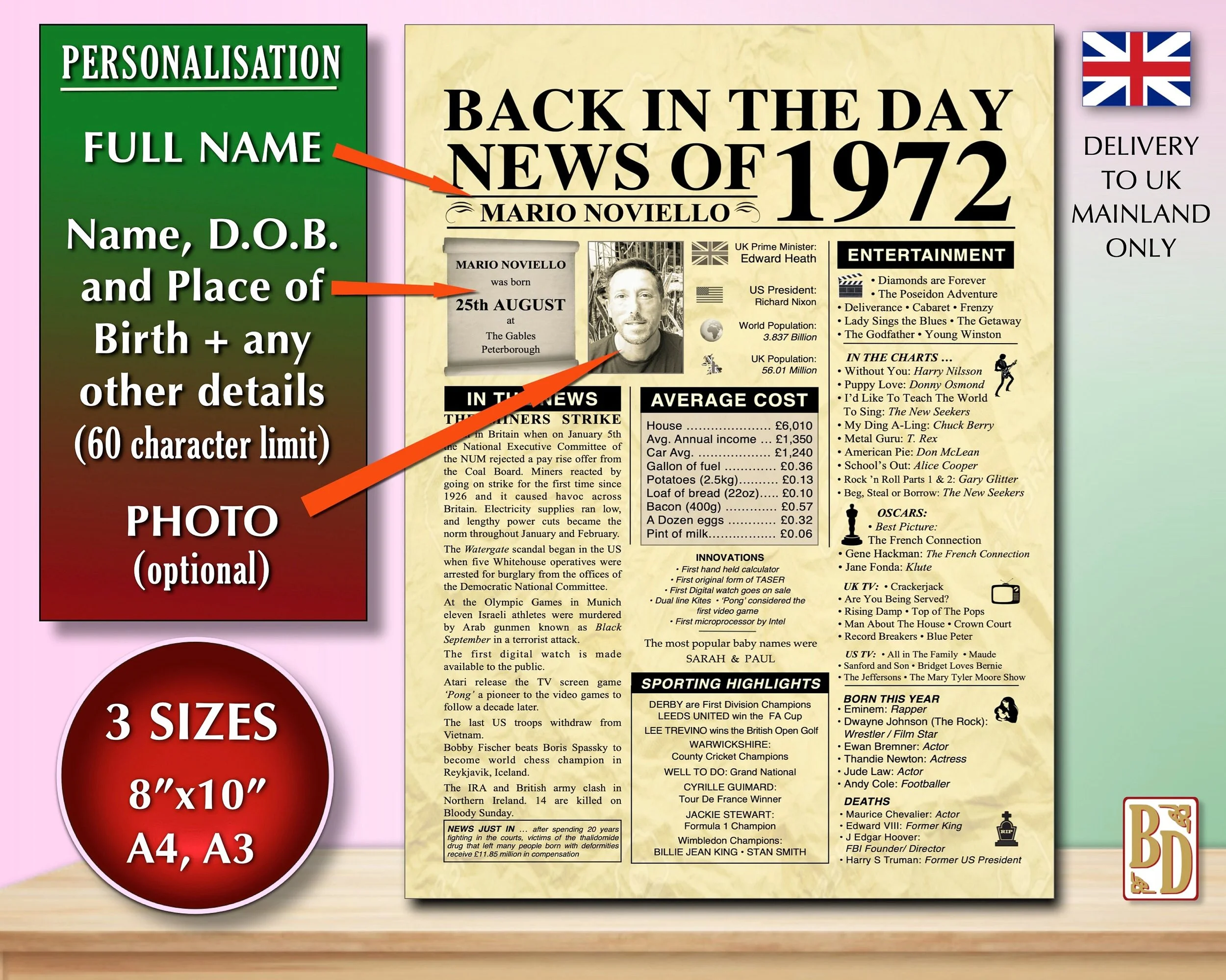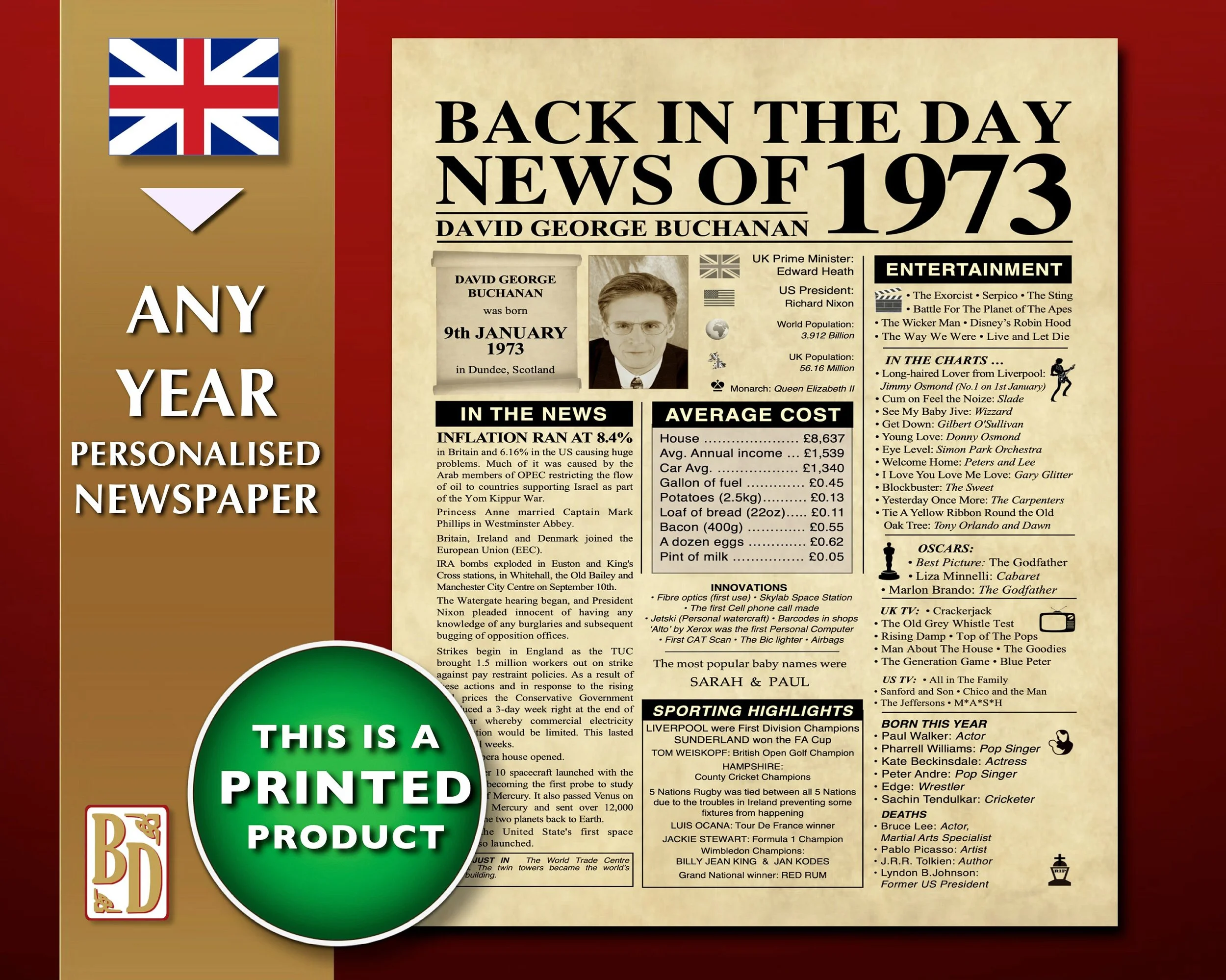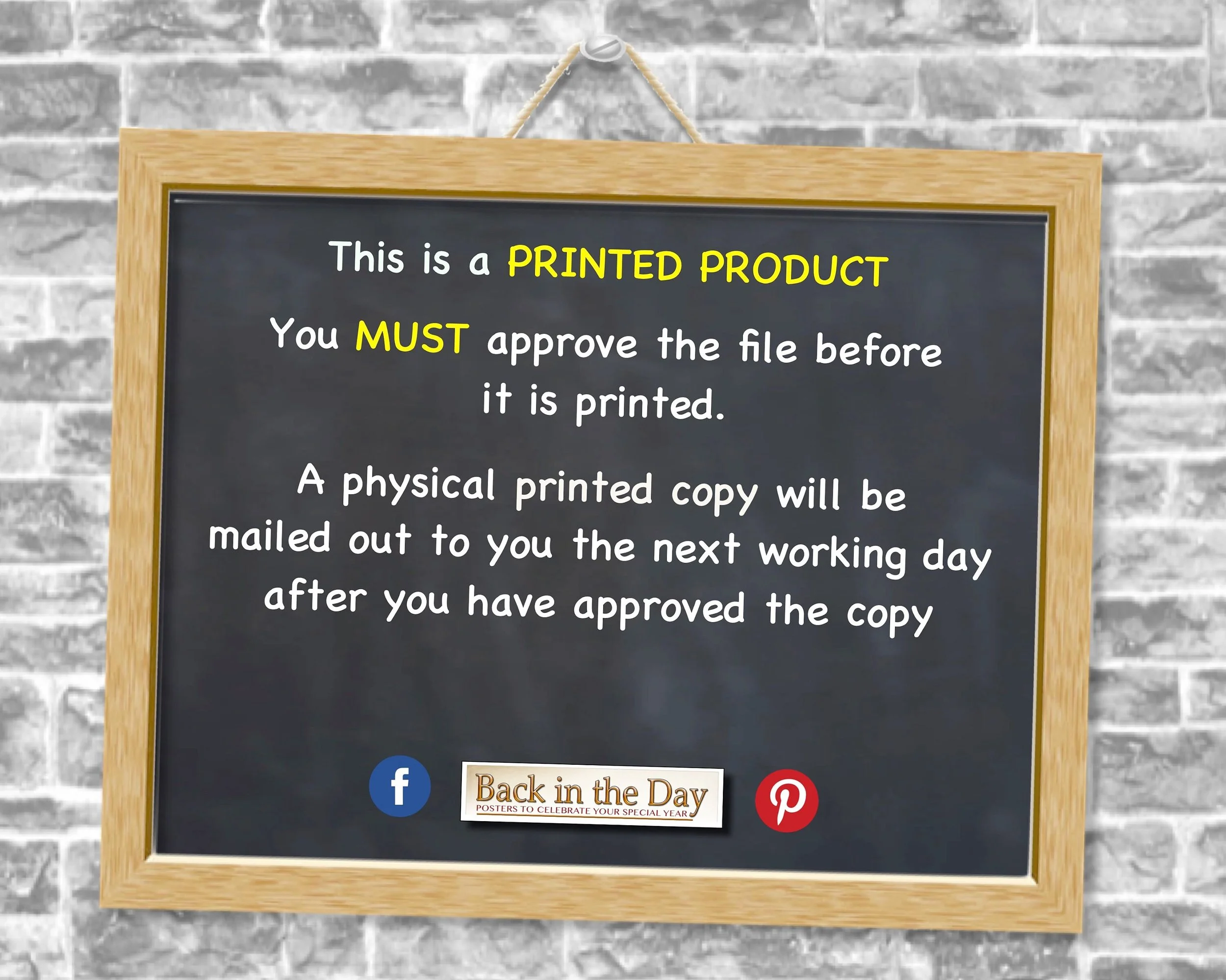 Back in Any Year POSTERS Categories: All Back in Any Year POSTERS News / Video BESTSELLERS News Direct DOWNLOADS Direct DOWNLOADS Colour 1920s -1930s POSTERS Back in 1940s POSTERS Back in 1950s POSTERS Back in 1960s POSTERS Back in 1970s POSTERS Back in 1980s POSTERS Back in 1990s POSTERS Back in 2000s POSTERS Back in 2010-20 POSTERS Historical POSTERS Anniversary POSTERS Special Occasion POSTERS Personalised CARDS QUIZZES & Trivia PRINTED items Great Moments in SPORT Back in Any Year POSTERS PRINTED, The year you were born, Any Year,Personalised Newspaper poster UK version, Back in the Day, Birthday Sign from £14.49 View Options PRINTED,The year you were born,ANY YEAR,Personalised Chalkboard poster,Back in the Day, Birthday Sign from £13.49 View Options 50th birthday gift, newspaper sign, the year you were born newspaper poster, ANY YEAR digital birthday gift £9.25 Purchase Added! 1970s,1980s,1990s,2000s, Old Newspaper style Poster, UK version £3.99 Purchase Added! Newspaper style Poster Customized for ANY YEAR, and COUNTRY £18.99 Ireland Canada Australia South Africa New Zealand Purchase Added! Birthday gift poster, 1930s - 1990s ANY YEAR vintage printed newspaperfront page from £14.50 Select Select size 8"x10" A4 (210 x 297) 11" x 14" A3 (297 x 420) 16" x 20" Purchase Added! Newspaper style Poster Personalized for ANY YEAR, and COUNTRY £18.99 Purchase Added! PRINTED, The year you were born,Any Year,Personalised Newspaper poster,US VERSION, Back in the Day, Birthday Sign.NP01 from £22.99 View Options The year you were born,ANY YEAR,Personalised Chalkboard style poster,DIGITAL,Back in the Day,Printable Birthday Sign from £9.49 View Options PRINTED,The year you were born,ANY YEAR,Personalised Chalkboard poster,Back in the Day, Birthday Sign from £13.49 View Options The year you were born,ANY YEAR,Personalised Chalkboard style poster,DIGITAL,Back in the Day,Printable Birthday Sign from £9.49 View Options Printed Birthday newspaper personalised front page from £13.50 View Options 3 Posters. The day you were born, any year,Personalised Newspaper style poster, PRINTED,Back in the Day,Birthday Sign X 3 from £35.00 View Options 1940s,1950s,1960s,1970s, Old Newspaper style Poster, UK version £3.99 Purchase Added! PRINTED,The year you were born,CANADIAN version with Mahogany frame including postage £18.00 Purchase Added! Birthday celebration, Personalised Newspaper poster, A4 on A3 with space to sign £28.00 Purchase Added! PRINTED,The year you were born,ANY YEAR,Personalised Chalkboard poster,Back in the Day, Birthday Sign from £13.75 View Options The day you were born, any year,Personalised Newspaper style poster,DIGITAL,NOT PRINTED,Back in the Day,Birthday Sign £9.75 Purchase Added! The day you were born, any year,Personalised Newspaper style poster, PRINTED,Back in the Day,Birthday Sign from £14.49 View Options