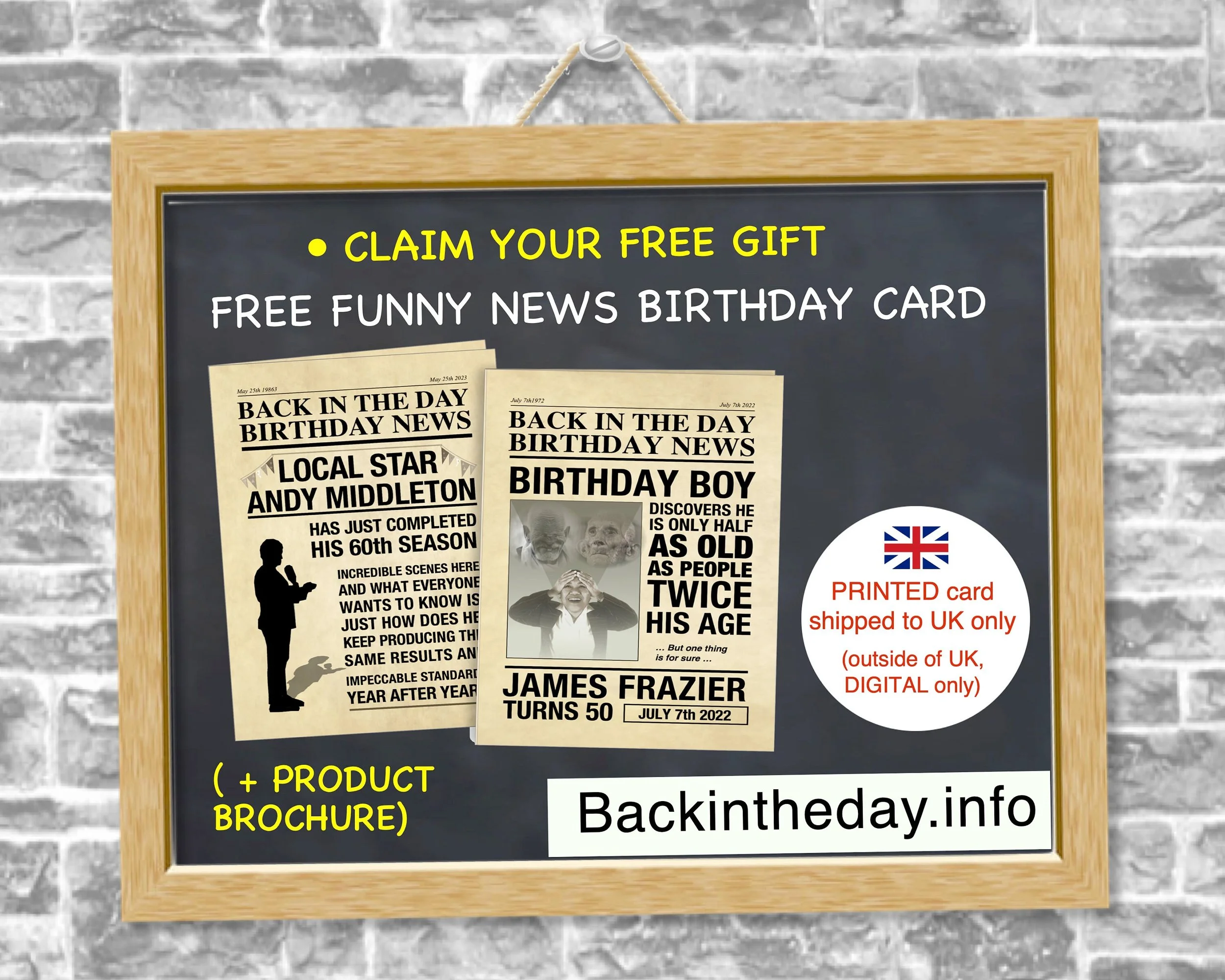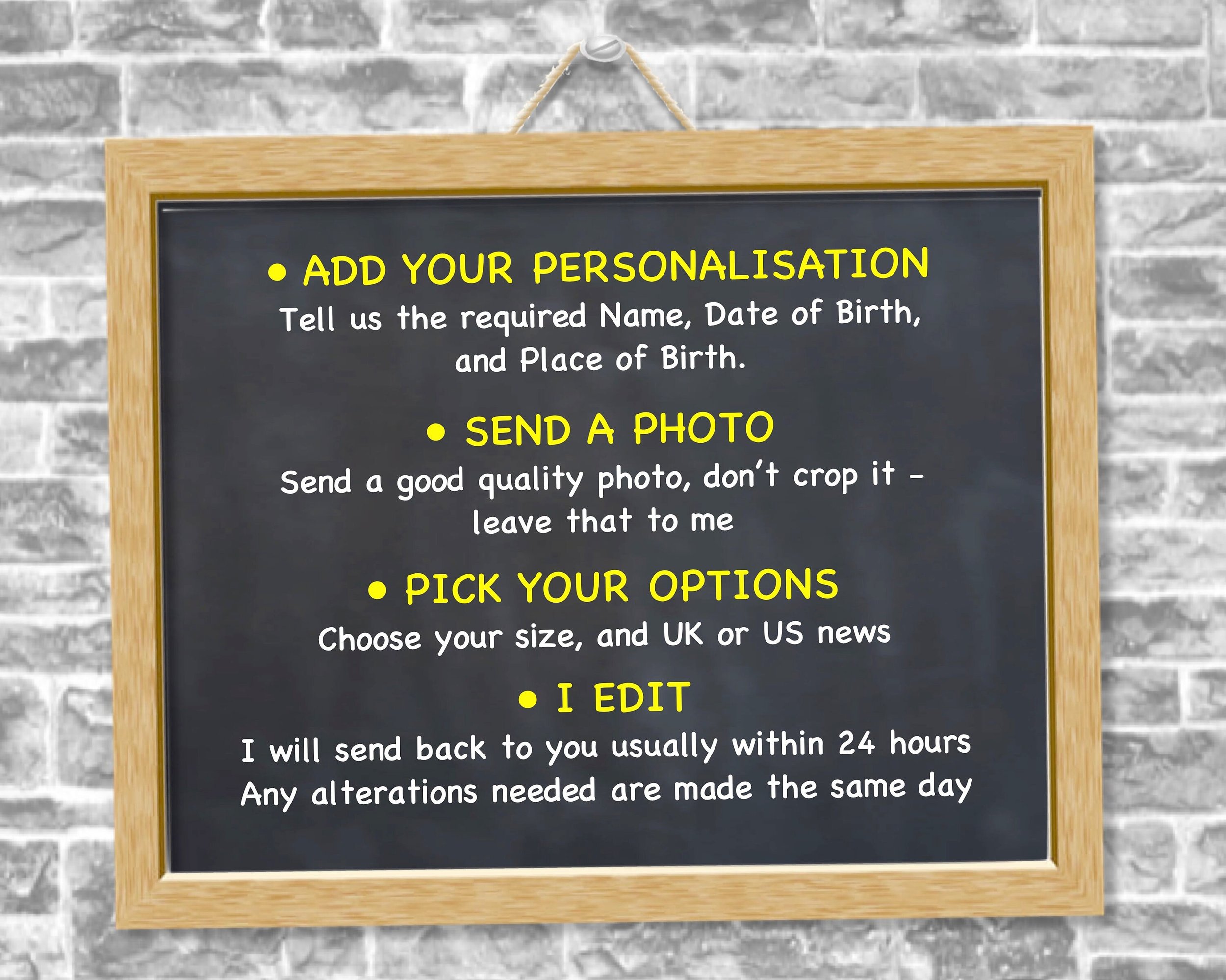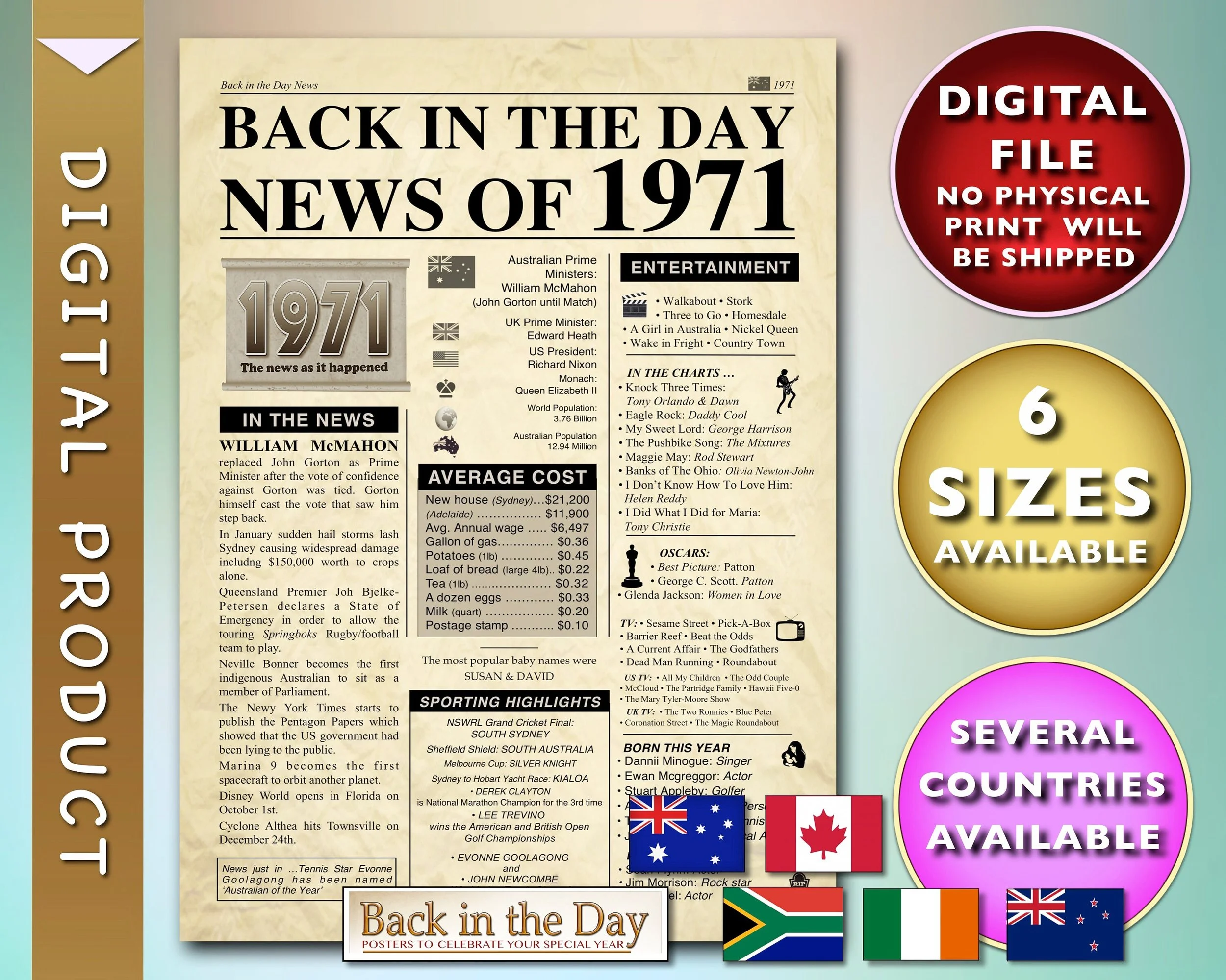 Back in Any Year POSTERS Categories: All Back in Any Year POSTERS News / Video BESTSELLERS News Direct DOWNLOADS Direct DOWNLOADS Colour 1920s -1930s POSTERS Back in 1940s POSTERS Back in 1950s POSTERS Back in 1960s POSTERS Back in 1970s POSTERS Back in 1980s POSTERS Back in 1990s POSTERS Back in 2000s POSTERS Back in 2010-20 POSTERS Historical POSTERS Anniversary POSTERS Special Occasion POSTERS Personalised CARDS QUIZZES & Trivia PRINTED items Great Moments in SPORT Back in Any Year POSTERS PRINTED, The year you were born, Any Year,Personalised Newspaper poster UK version, Back in the Day, Birthday Sign from £14.49 View Options PRINTED,The year you were born,ANY YEAR,Personalised Chalkboard poster,Back in the Day, Birthday Sign from £13.49 View Options 50th birthday gift, newspaper sign, the year you were born newspaper poster, ANY YEAR digital birthday gift £9.25 Purchase Added! 1970s,1980s,1990s,2000s, Old Newspaper style Poster, UK version £3.99 Purchase Added! Newspaper style Poster Customized for ANY YEAR, and COUNTRY £18.99 Ireland Canada Australia South Africa New Zealand Purchase Added! Birthday gift poster, 1930s - 1990s ANY YEAR vintage printed newspaperfront page from £14.50 Select Select size 8"x10" A4 (210 x 297) 11" x 14" A3 (297 x 420) 16" x 20" Purchase Added! Newspaper style Poster Personalized for ANY YEAR, and COUNTRY £18.99 Purchase Added! PRINTED, The year you were born,Any Year,Personalised Newspaper poster,US VERSION, Back in the Day, Birthday Sign.NP01 from £22.99 View Options The year you were born,ANY YEAR,Personalised Chalkboard style poster,DIGITAL,Back in the Day,Printable Birthday Sign from £9.49 View Options PRINTED,The year you were born,ANY YEAR,Personalised Chalkboard poster,Back in the Day, Birthday Sign from £13.49 View Options The year you were born,ANY YEAR,Personalised Chalkboard style poster,DIGITAL,Back in the Day,Printable Birthday Sign from £9.49 View Options Printed Birthday newspaper personalised front page from £13.50 View Options 3 Posters. The day you were born, any year,Personalised Newspaper style poster, PRINTED,Back in the Day,Birthday Sign X 3 from £35.00 View Options 1940s,1950s,1960s,1970s, Old Newspaper style Poster, UK version £3.99 Purchase Added! PRINTED,The year you were born,CANADIAN version with Mahogany frame including postage £18.00 Purchase Added! Birthday celebration, Personalised Newspaper poster, A4 on A3 with space to sign £28.00 Purchase Added! PRINTED,The year you were born,ANY YEAR,Personalised Chalkboard poster,Back in the Day, Birthday Sign from £13.75 View Options The day you were born, any year,Personalised Newspaper style poster,DIGITAL,NOT PRINTED,Back in the Day,Birthday Sign £9.75 Purchase Added! The day you were born, any year,Personalised Newspaper style poster, PRINTED,Back in the Day,Birthday Sign from £14.49 View Options