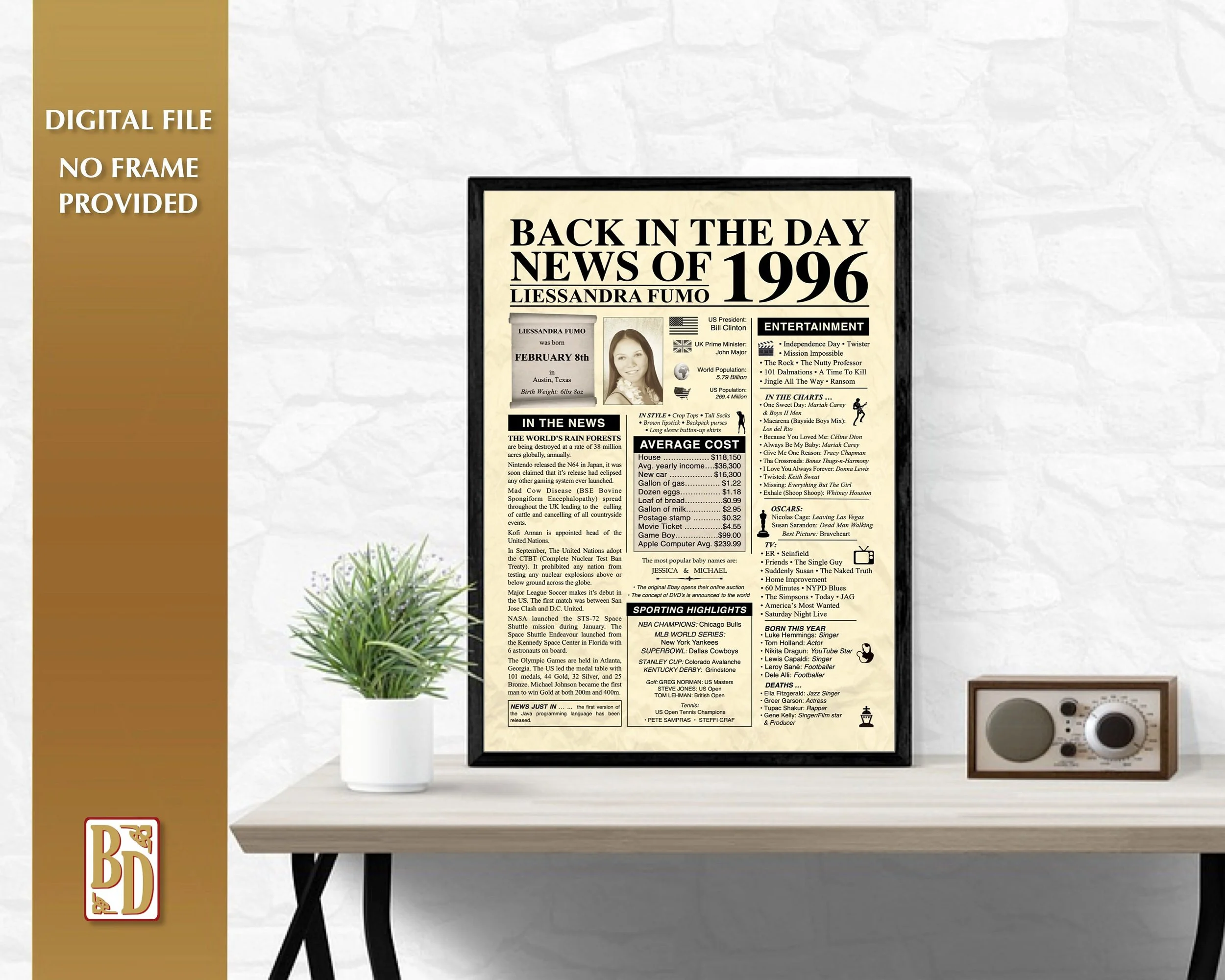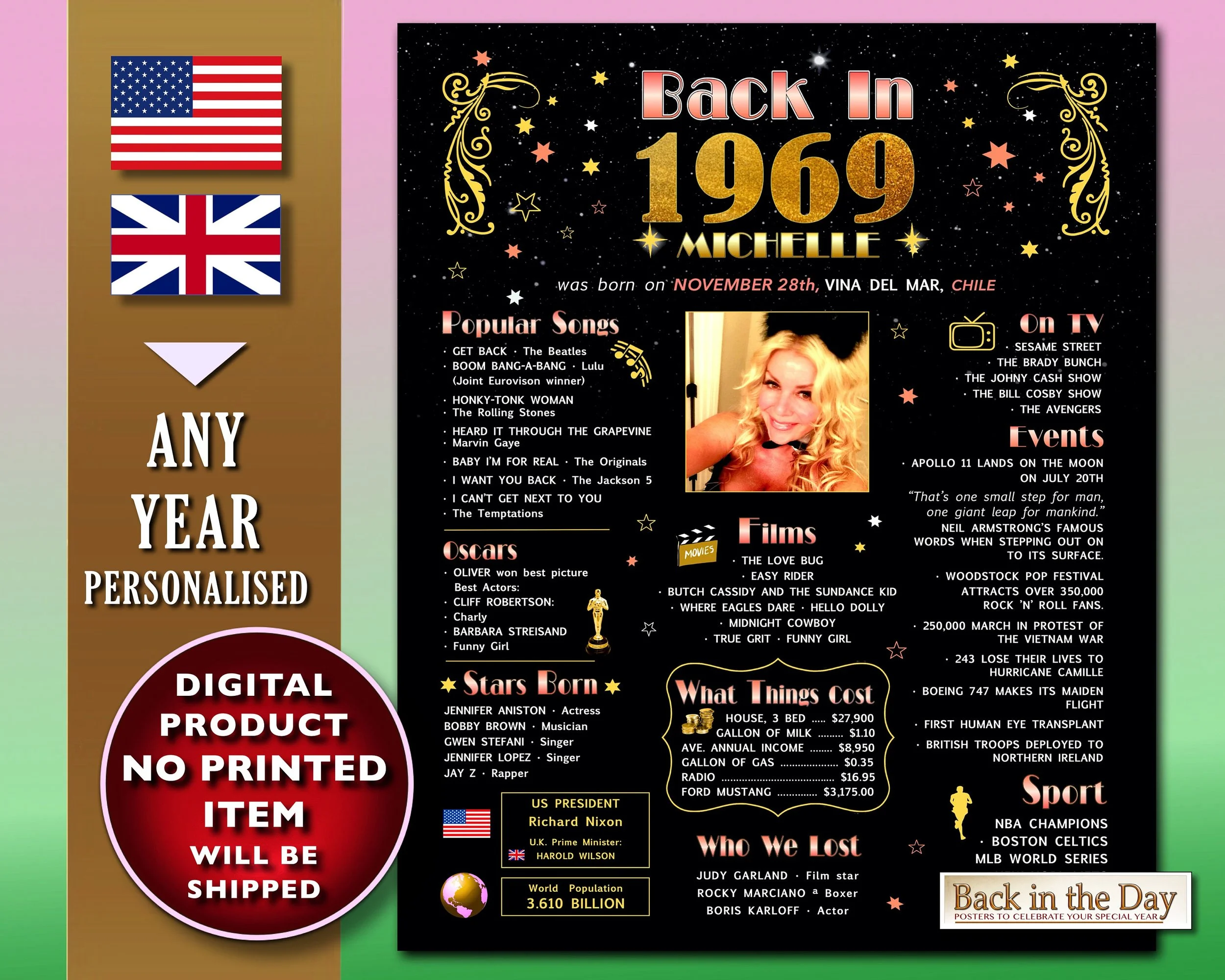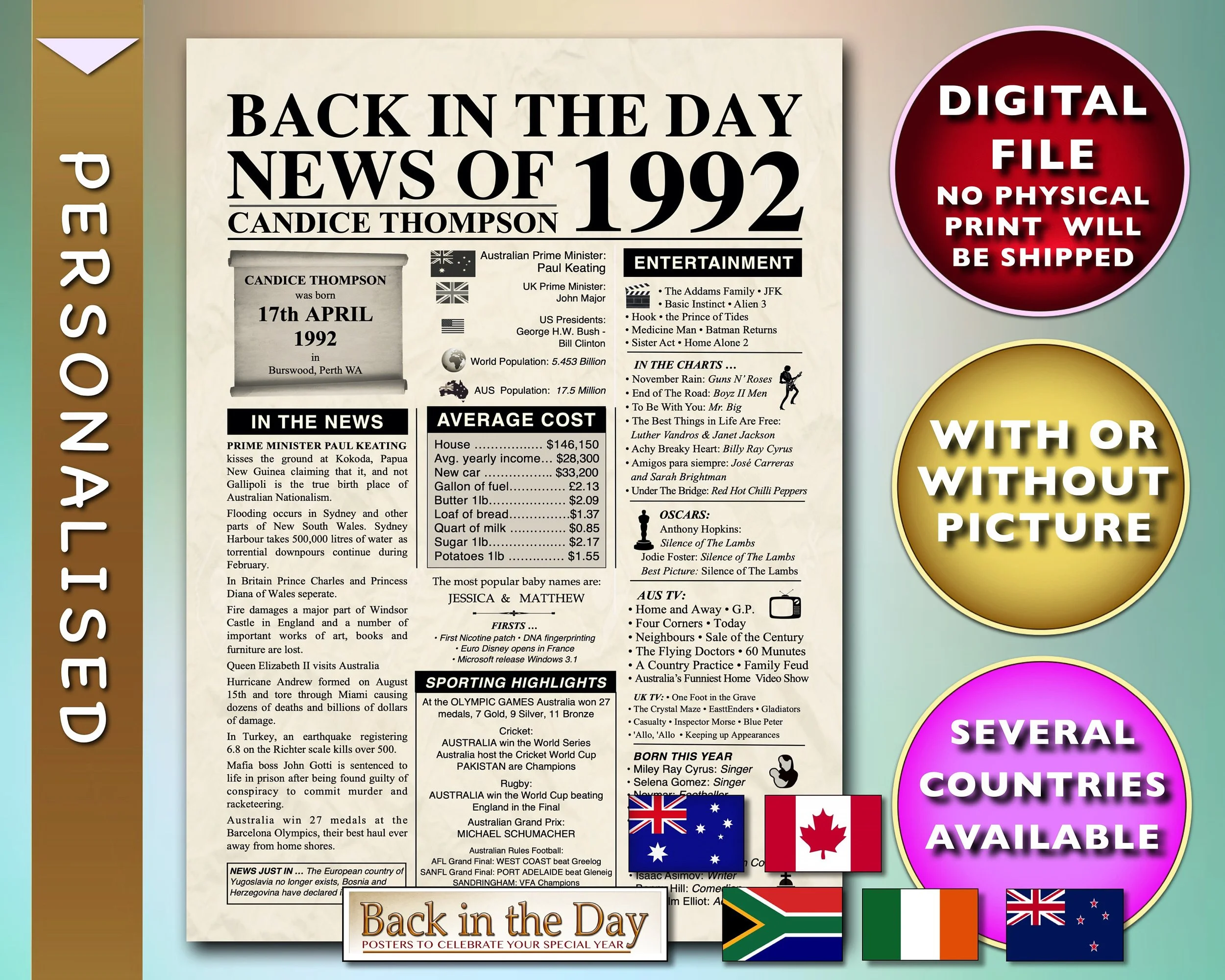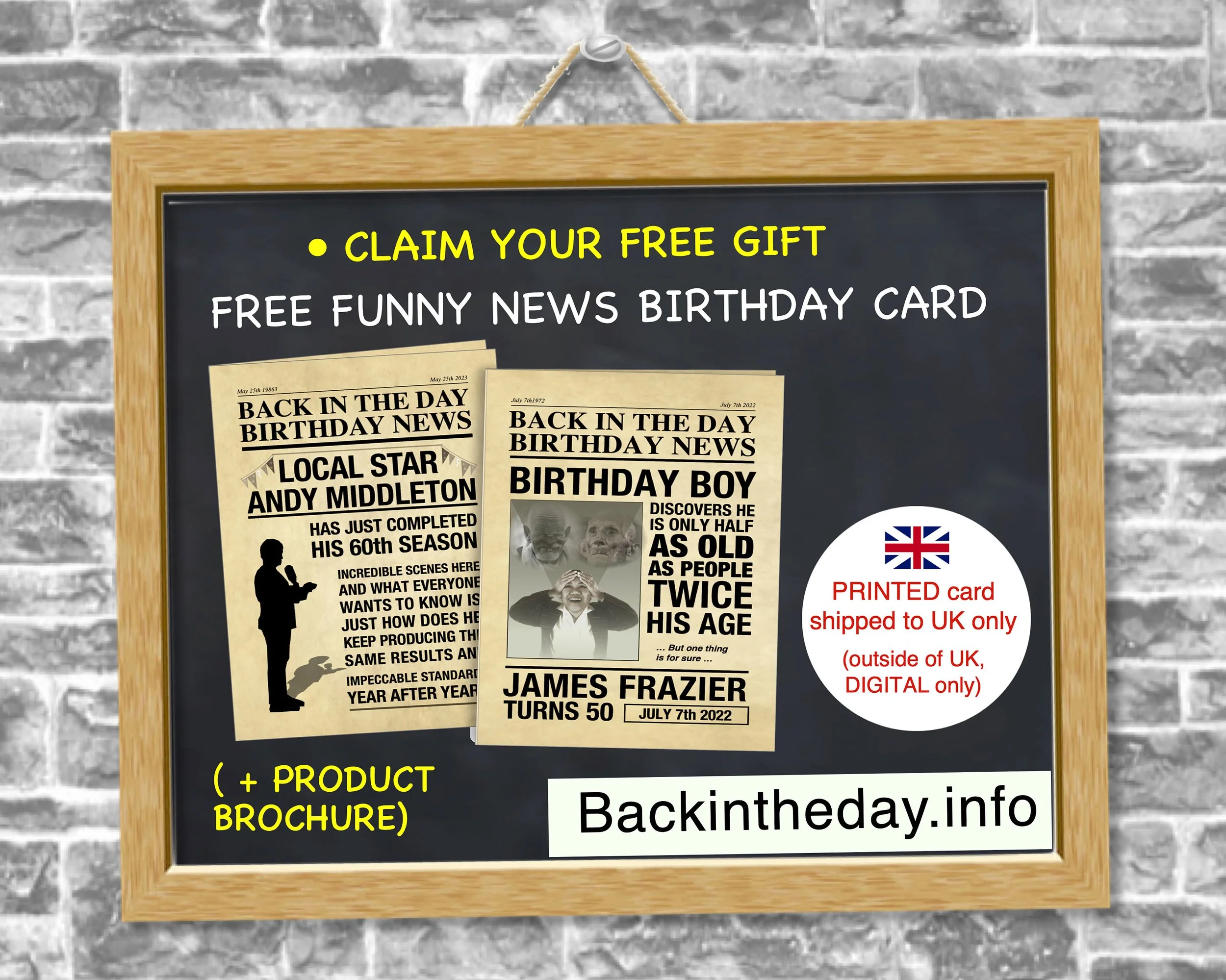 Back in Any Year POSTERS Categories: All Back in Any Year POSTERS News / Video BESTSELLERS News Direct DOWNLOADS Direct DOWNLOADS Colour 1920s -1930s POSTERS Back in 1940s POSTERS Back in 1950s POSTERS Back in 1960s POSTERS Back in 1970s POSTERS Back in 1980s POSTERS Back in 1990s POSTERS Back in 2000s POSTERS Back in 2010-20 POSTERS Historical POSTERS Anniversary POSTERS Special Occasion POSTERS Personalised CARDS QUIZZES & Trivia PRINTED items Great Moments in SPORT Back in Any Year POSTERS PRINTED, The year you were born, Any Year,Personalised Newspaper poster UK version, Back in the Day, Birthday Sign from £14.49 View Options PRINTED,The year you were born,ANY YEAR,Personalised Chalkboard poster,Back in the Day, Birthday Sign from £13.49 View Options 50th birthday gift, newspaper sign, the year you were born newspaper poster, ANY YEAR digital birthday gift £9.25 Purchase Added! 1970s,1980s,1990s,2000s, Old Newspaper style Poster, UK version £3.99 Purchase Added! Newspaper style Poster Customized for ANY YEAR, and COUNTRY £18.99 Ireland Canada Australia South Africa New Zealand Purchase Added! Birthday gift poster, 1930s - 1990s ANY YEAR vintage printed newspaperfront page from £14.50 Select Select size 8"x10" A4 (210 x 297) 11" x 14" A3 (297 x 420) 16" x 20" Purchase Added! Newspaper style Poster Personalized for ANY YEAR, and COUNTRY £18.99 Purchase Added! PRINTED, The year you were born,Any Year,Personalised Newspaper poster,US VERSION, Back in the Day, Birthday Sign.NP01 from £22.99 View Options The year you were born,ANY YEAR,Personalised Chalkboard style poster,DIGITAL,Back in the Day,Printable Birthday Sign from £9.49 View Options PRINTED,The year you were born,ANY YEAR,Personalised Chalkboard poster,Back in the Day, Birthday Sign from £13.49 View Options The year you were born,ANY YEAR,Personalised Chalkboard style poster,DIGITAL,Back in the Day,Printable Birthday Sign from £9.49 View Options Printed Birthday newspaper personalised front page from £13.50 View Options 3 Posters. The day you were born, any year,Personalised Newspaper style poster, PRINTED,Back in the Day,Birthday Sign X 3 from £35.00 View Options 1940s,1950s,1960s,1970s, Old Newspaper style Poster, UK version £3.99 Purchase Added! PRINTED,The year you were born,CANADIAN version with Mahogany frame including postage £18.00 Purchase Added! Birthday celebration, Personalised Newspaper poster, A4 on A3 with space to sign £28.00 Purchase Added! PRINTED,The year you were born,ANY YEAR,Personalised Chalkboard poster,Back in the Day, Birthday Sign from £13.75 View Options The day you were born, any year,Personalised Newspaper style poster,DIGITAL,NOT PRINTED,Back in the Day,Birthday Sign £9.75 Purchase Added! The day you were born, any year,Personalised Newspaper style poster, PRINTED,Back in the Day,Birthday Sign from £14.49 View Options